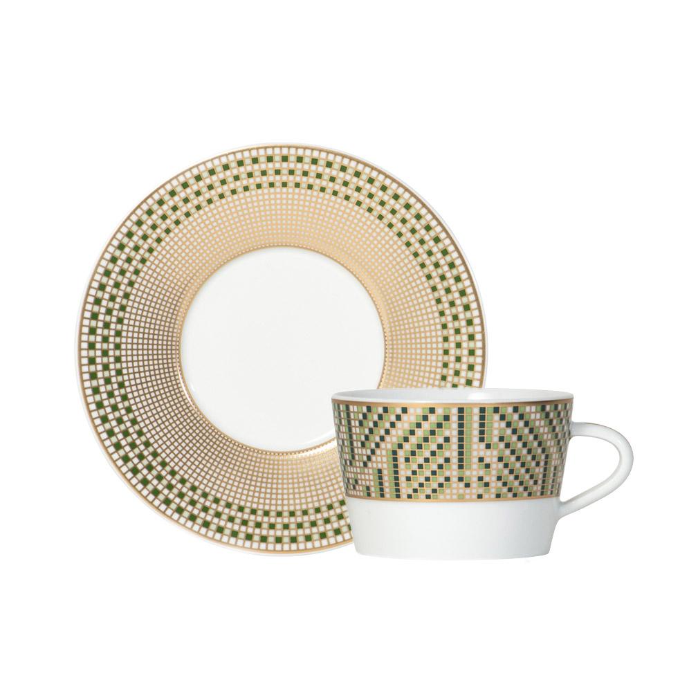 Wie ein antikes Mosaik setzt sich das Dekor der Kollektion aus kleinen Kacheln zusammen, die einem goldenen Gitternetz folgen. Raffiniert gesetzte Flächen in Hellgrün, Smaragdgrün und Schwarz formen geometrische Motive, die genauso gut aus einer römischen Villa als auch aus einem New Yorker Wolkenkratzer des frühen 20. Jahrhunderts stammen könnten. Klassizistisch trifft kubistisch – ein origineller Stilmix, der mit seiner präzisen Ausführung beeindruckt.