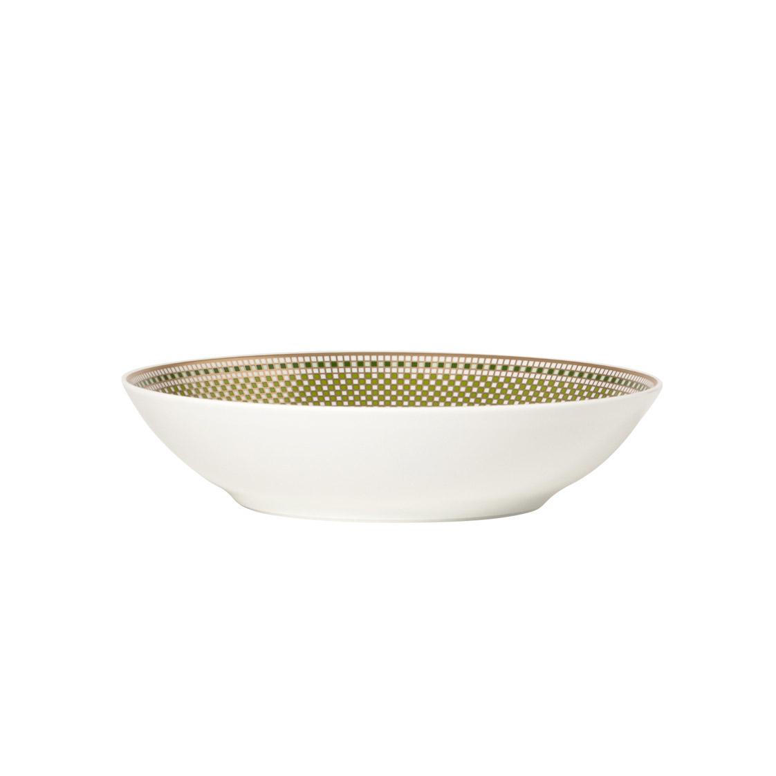 Wie ein antikes Mosaik setzt sich das Dekor der Kollektion aus kleinen Kacheln zusammen, die einem goldenen Gitternetz folgen. Raffiniert gesetzte Flächen in Hellgrün, Smaragdgrün und Schwarz formen geometrische Motive, die genauso gut aus einer römischen Villa als auch aus einem New Yorker Wolkenkratzer des frühen 20. Jahrhunderts stammen könnten. Klassizistisch trifft kubistisch – ein origineller Stilmix, der mit seiner präzisen Ausführung beeindruckt.