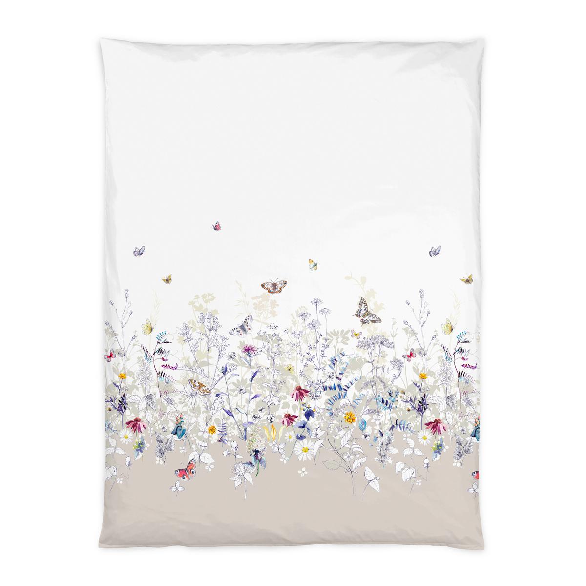 Die Bettwäsche "Aviva" von Christian Fischbacher lässt den Frühling leise ins Schlafzimmer einziehen. Auf einem sanften, beigen Farbverlauf entfaltet sich eine fein gezeichnete Pflanzenbordüre aus Sonnenhut, Zinnien, Margeriten und Johanniskraut. Darüber schweben Schmetterlinge in leuchtenden Farben und verleihen dem Dessin eine natürliche Leichtigkeit. Das Dessin-Verlauf geht nach oben hin harmonisch in einen ruhigen, weissen Fond über und sorgt für eine luftige, elegante Wirkung.
