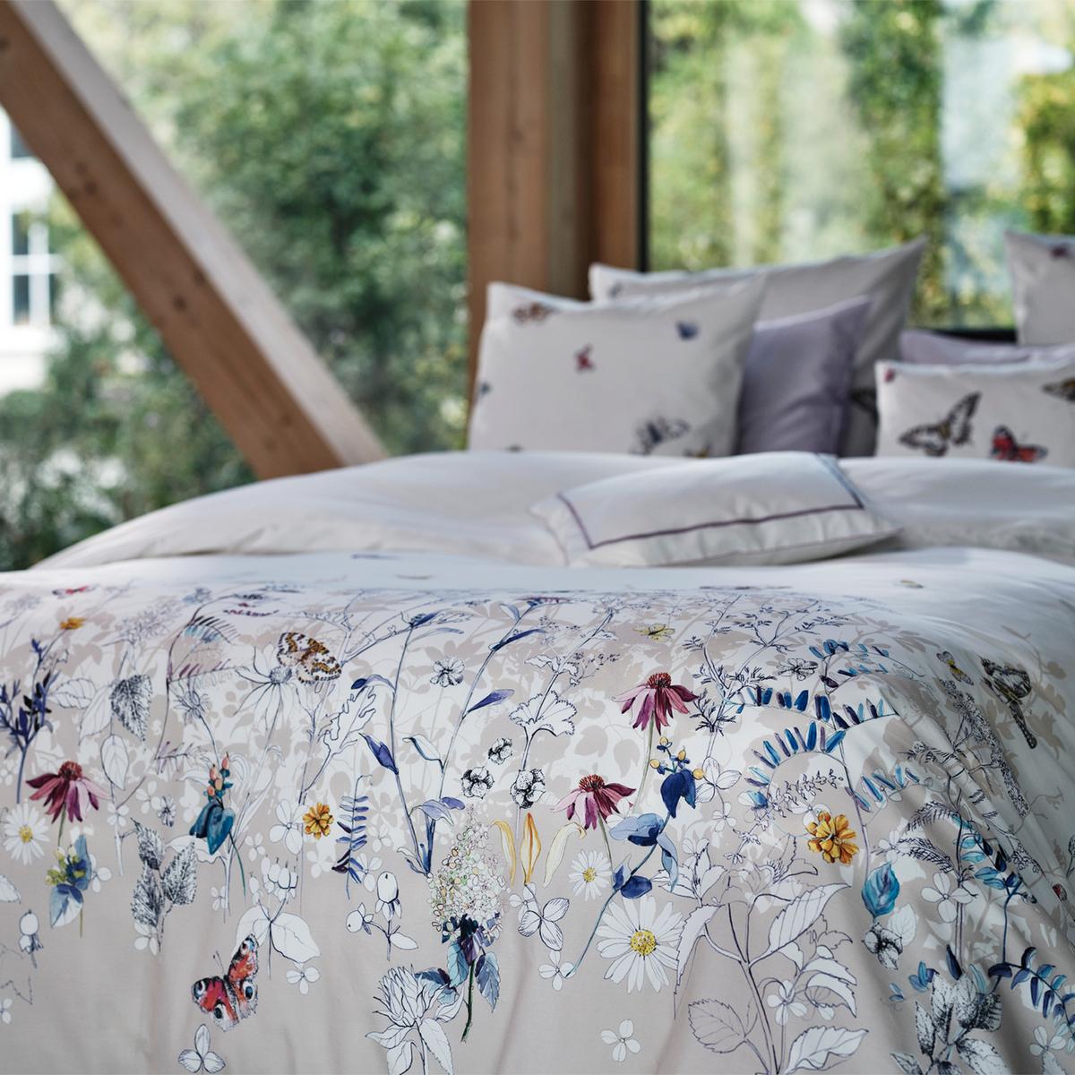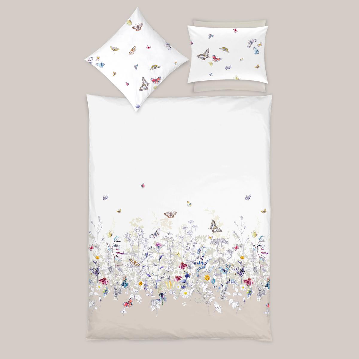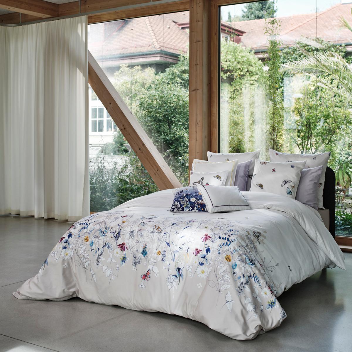 Die Bettwäsche "Aviva" von Christian Fischbacher lässt den Frühling leise ins Schlafzimmer einziehen. Auf einem sanften, beigen Farbverlauf entfaltet sich eine fein gezeichnete Pflanzenbordüre aus Sonnenhut, Zinnien, Margeriten und Johanniskraut. Darüber schweben Schmetterlinge in leuchtenden Farben und verleihen dem Dessin eine natürliche Leichtigkeit. Das Dessin-Verlauf geht nach oben hin harmonisch in einen ruhigen, weissen Fond über und sorgt für eine luftige, elegante Wirkung.