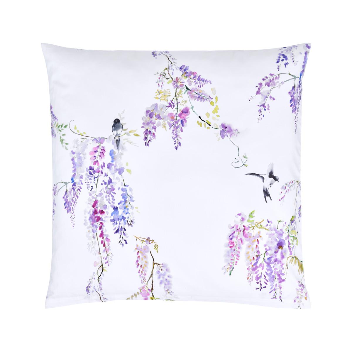 Von Rosa über Pink, Lila und Blau überziehen Blüten des japanischen Blauregens Decken und Kissen der Bettwäsche "Purple Rain" von Christian Fischbacher, wie ein feines Netz. Dazwischen ertönt das Gezwitscher von jungen Schwalben, auf feinen Ästchen sitzend oder hoch in den Lüften tanzend. Die Motive wurden im Atelier Christian Fischbacher kunstvoll aquarelliert und in der Druckerei in Italien mit viel Liebe zum Detail auf den Stoff gebracht.