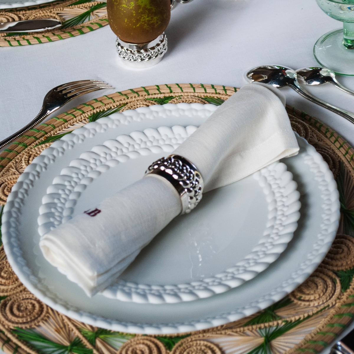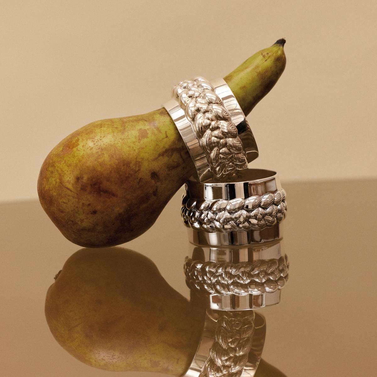 Großzügig, sinnlich, organisch. Der versilberte Serviettenring "Babylone" von Christofle bringt den Glanz und Lebensstil der besten Adressen von Paris in Ihre Interieurs. Um die Mitte des schlichten Serviettenrings legt sich eine filigrane Version des Zopfdekors der Babylone Kollektion. Hergestellt im aufwendigen Lost-Wax Verfahren, verblüfft das Dekor mit tiefen Reliefs und den organischen Rundungen eines frisch gebackenen Hefezopfs. Eine von Hand aufgetragene Patina unterstreicht die Details des Dekors und die klaren Linien des Serviettenrings.