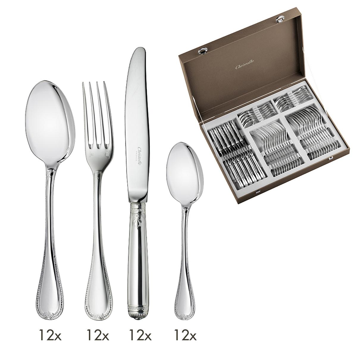 "Malmaison" versilbert, 48-tlg. mit Etui: je 12 x Tafellöffel, -gabel, -messer und Kaffeelöffel von Christofle