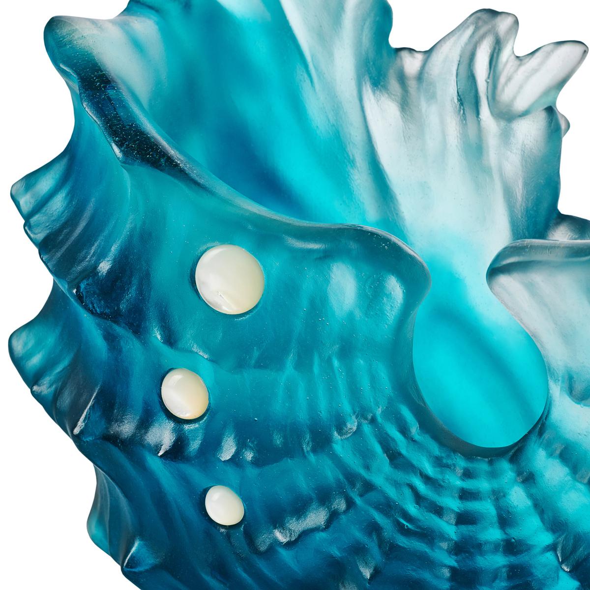 Dynamisch fügen sich kraftvolle Wellen wie zufällig zu einer fantasievollen Muschelform zusammen. Ein Farbverlauf von Dunkelblau bis Weiß verleiht der Vase den Anschein, aus erstarrtem Meereswasser zu bestehen. Sechs Perlmuttplättchen verzieren die Vorderseite und glänzen wie der weiße Strand in der Sonne. Mit ihrer weiten Öffnung und rundlichen, asymmetrischen Form eignet sich die Vase ideal zum Präsentieren ausladender Blumenarrangements.