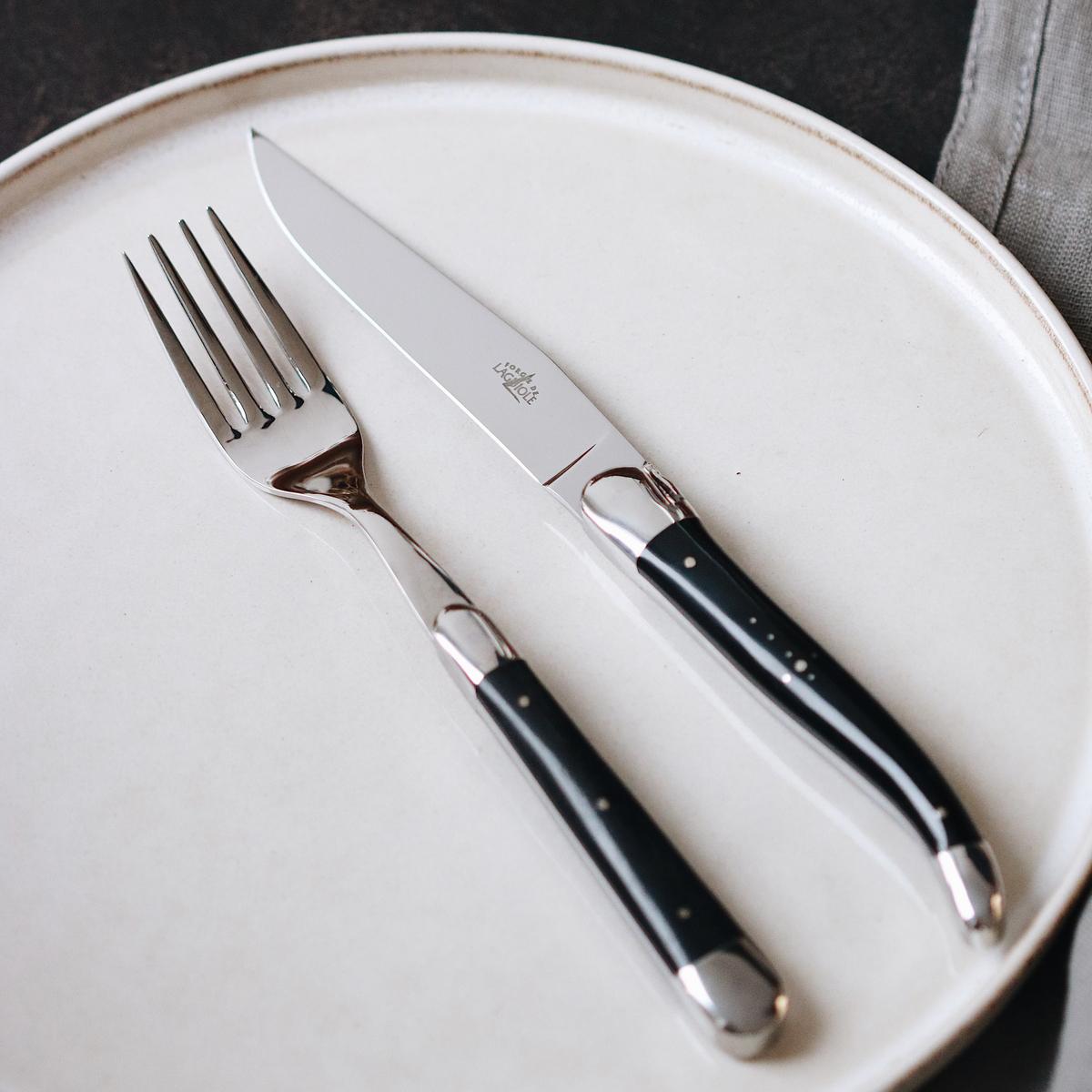 Schlanke Griffe aus schwarzer Hornspitze, die in glänzenden Edelstahl übergehen. Nobel und kontrastreich präsentiert sich das Tafelbesteck "Horn" der französischen Messervirtuosen von Forge de Laguiole.