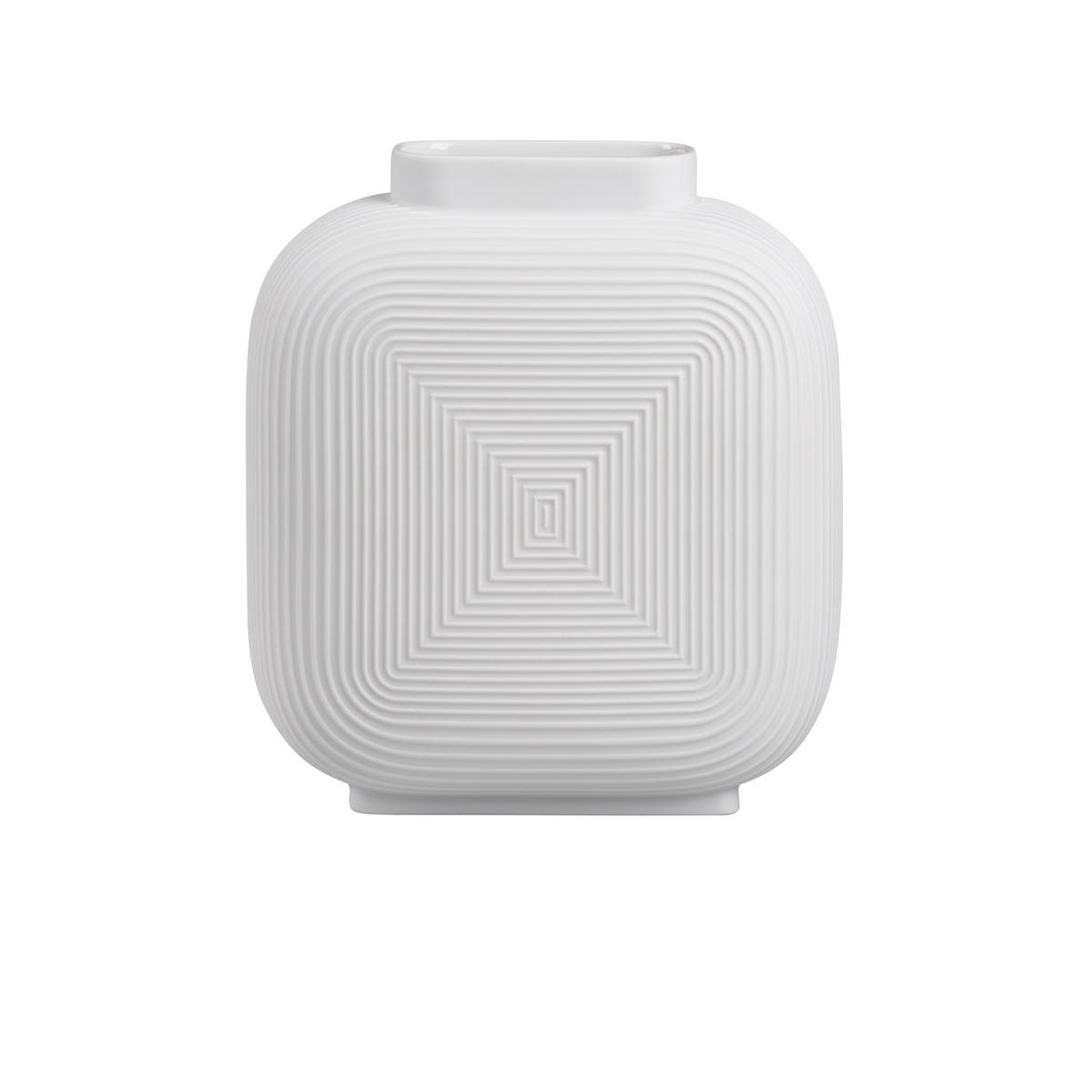Entspannende Naturstrukturen. Die Vasen "Linda" von Fürstenberg sind von der meditativen Schlichtheit japanischer Zengärten inspiriert. Ihre ungewöhnliche, minimalistische Quadratform mit abgerundeten Ecken erinnert an Papierlampions und verleiht ihren Silhouetten einen modernen Charakter. Ein feines Rillendekor gibt den weißen Porzellanoberflächen Rhythmus und Struktur. Die Kollektion enthält Vasen mit satinierten und glasierten Oberflächen in zwei verschiedenen Größen sowie eine Ausführung mit exklusivem Goldrand.