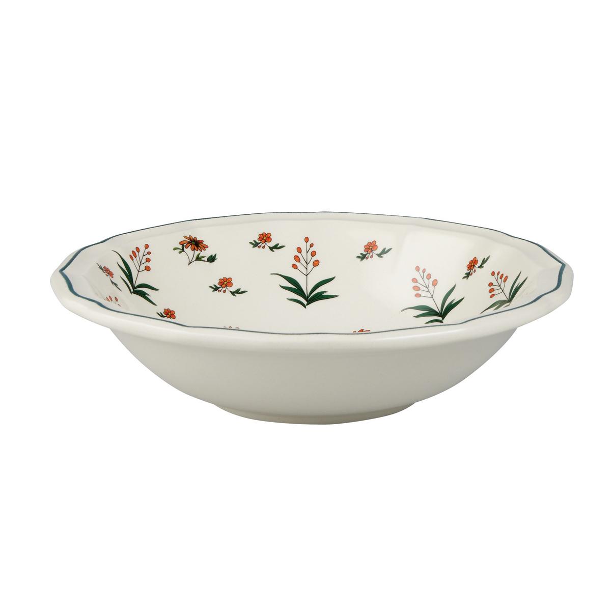 Serviert auf einem Kräuterbett. Mit dem Tafelservice "Herbier du Paradis" interpretiert Gien die ikonische "Oiseaux du Paradis" Kollektion neu. Eine Schar an kleinen Blumen und Kräutern mit roten Früchten und Blüten bevölkert die cremeweißen Fayencen als modernes All-Over-Pattern. Ein von Hand gezogener Zierstreifen in Petrol umrahmt das Dekor und unterstreicht die klassische Eleganz der geschwungenen Muschelform. Reduziert auf vier Tellerformen, eine Müslischüssel und eine Kuchenplatte, eignet sich Service ideal zum individuellen Mix and Match mit weiteren Gien Serien wie "Filets Rouge" und "Filets Acapulco".