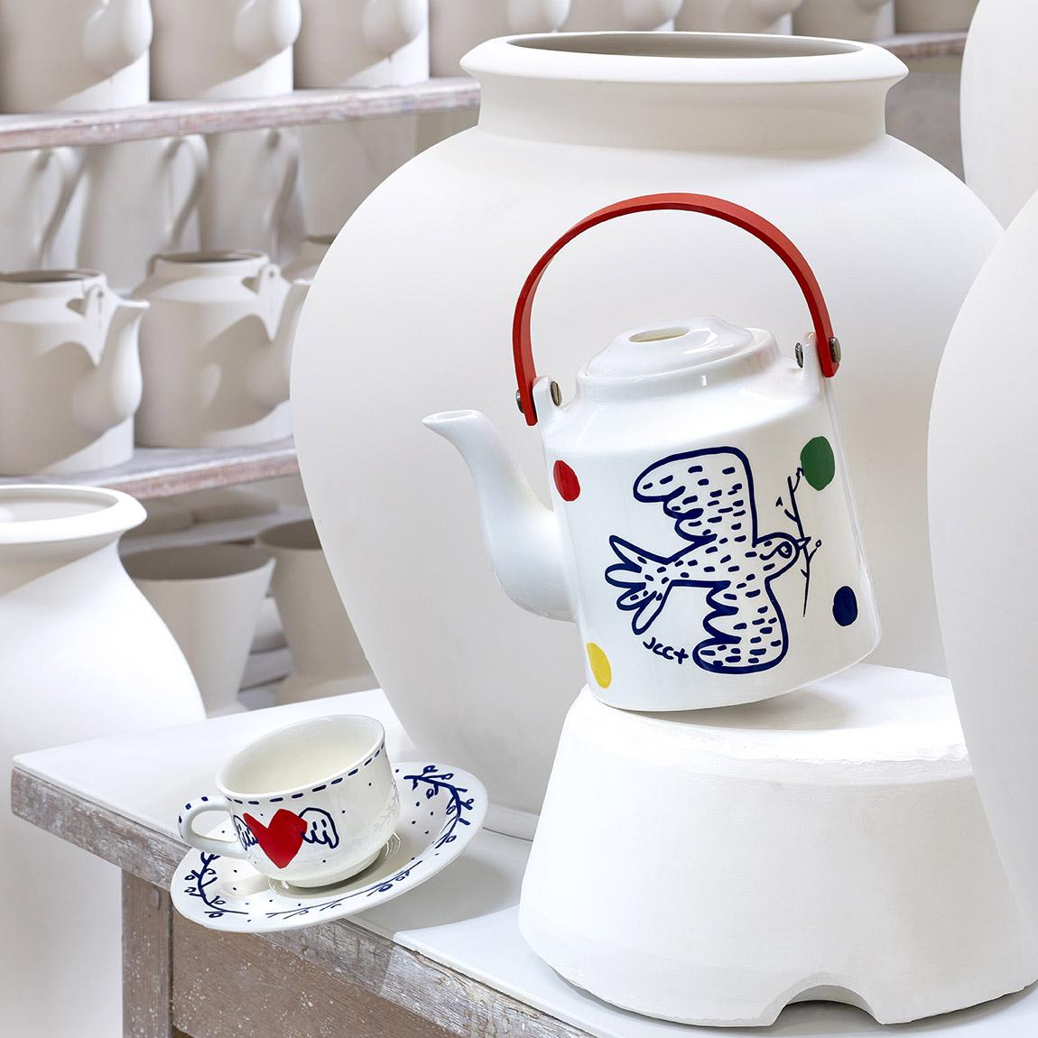 Die Hauptfarbe der expressionistischen Dekore ist der historische Blauton von Gien, mit dem de Castelbajac bewusst an die lange Geschichte der Manufaktur anknüpft. Tupfer aus kühnen Primärfarben addieren die radikale Farbigkeit, die das Werk des Designers auszeichnet. Die Dekore und die nostalgische Natur der Fayencen beschwören zusammen vergessene Erinnerungen und Gefühle aus der Kindheit herauf. Schrill, radikal, emotional – "L'Archipel Sentimental" ist ein lautes Ja zum Leben.