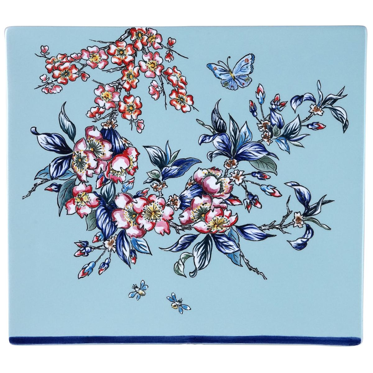 Die Vase und flache Schale "Le Jardin de Kyoto" von Gien sind ein Echo auf die große Vase "Jardin de Kyoto". Diese große Vase, die anlässlich des zweihundertjährigen Bestehens der Fayencerie im Jahr 2021 präsentiert wurde, ist die Neuauflage eines Stücks aus dem 19. Jahrhundert. Diese herrlichen Objekte sind das Ergebnis eines bewundernswerten Prozesses der Neuinterpretation und Anpassung durch die Künstler und Handwerker der Fabrik. Die Vase und quadratische Schale sind vollständig handbemalt und zeigen Motive, die von asiatischer Keramik inspiriert sind. Sie zeigen Kirschzweige und eine Vielzahl von Blüten. Ein paar Schmetterlinge und Bienen beleben die Szene.