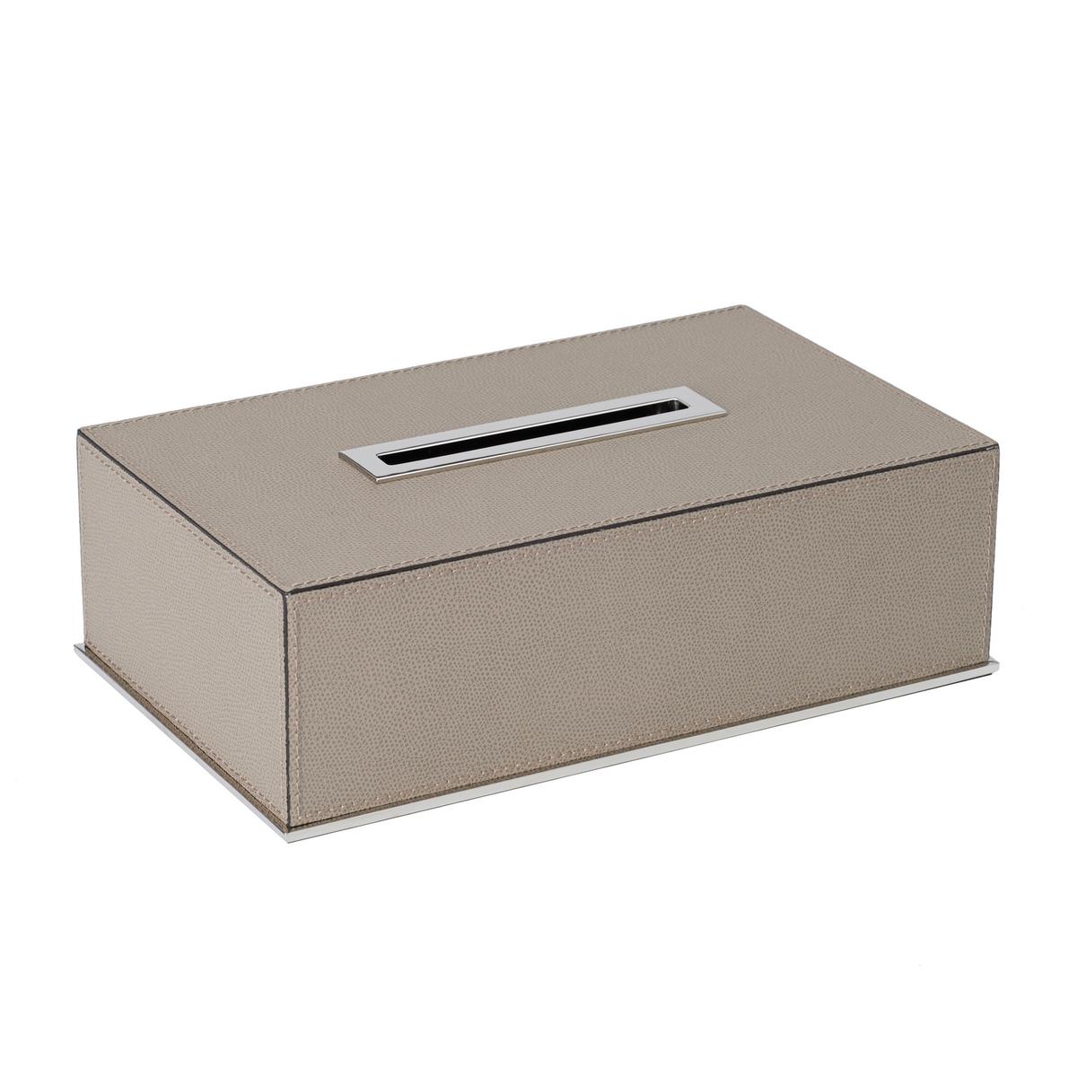 Mit den Kleenex-Boxen "Firenze" von GioBagnara lassen sich einfache Papierspenderboxen im Handumdrehen in edle Designerstücke verwandeln. Die Kleenex-Boxen "Firenze" bestehen aus einem Holzkorpus, der mit robustem Kalbsleder ummantelt wurde. Das Leder ist kratz- und wasserfest und lässt sich mit einem weichem Tuch und milder Seife leicht reinigen. Die Unterseite besitzt einen Klettverschluss, über den sich die Papiertücher blitzschnell einführen und transportieren lassen. Der Rahmen des Bodens und der Öffnung besteht aus platiniertem Messing.
