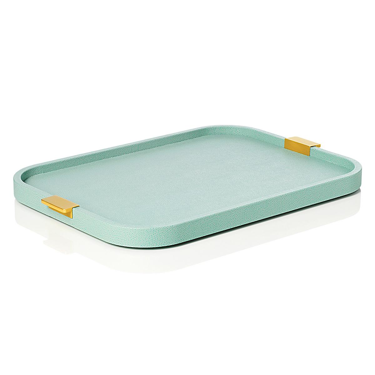 Sanft serviert. Die rechteckigen Tabletts "Puccini" in der Farbe Mint von GioBagnara sind auf das Wesentliche reduzierte Servierhilfen für hohe Ansprüche. Abgerundete Ecken und glänzende Messinggriffe verleihen den schlichten Tabletts eine harmonische und einladende Persönlichkeit. Handgefertigt aus bestem italienischen Kalbsleder auf einem stabilen Holzgerüst, sind die Tabletts genauso langlebig und zeitlos wie elegant. Der helle Grünton "Mint" bildet ein edles Ensemble mit den goldfarbenen Griffen und bringt einen frischen Farbakzent in jeden Raum.