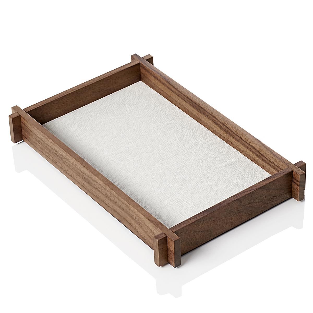 Zeitlose Eleganz in Holz und Leder: Die Vide-Poches "Structura“ von GioBagnara verbinden meisterhafte Handwerkskunst mit einladendem Vintage-Charme. Raffiniert gestaltete L-förmige Ecken verleihen dem Rahmen aus edlem Walnussholz seine unverwechselbare Silhouette, während die Ablagefläche aus geprägtem Kalbsleder in zartem Off-White für feine Kontraste sorgt. Die Kombination aus warmem Holz und sanft strukturiertem Leder schafft eine harmonische Balance im Stil des Mid-Century Modern – elegant, wohnlich und voller Charakter.