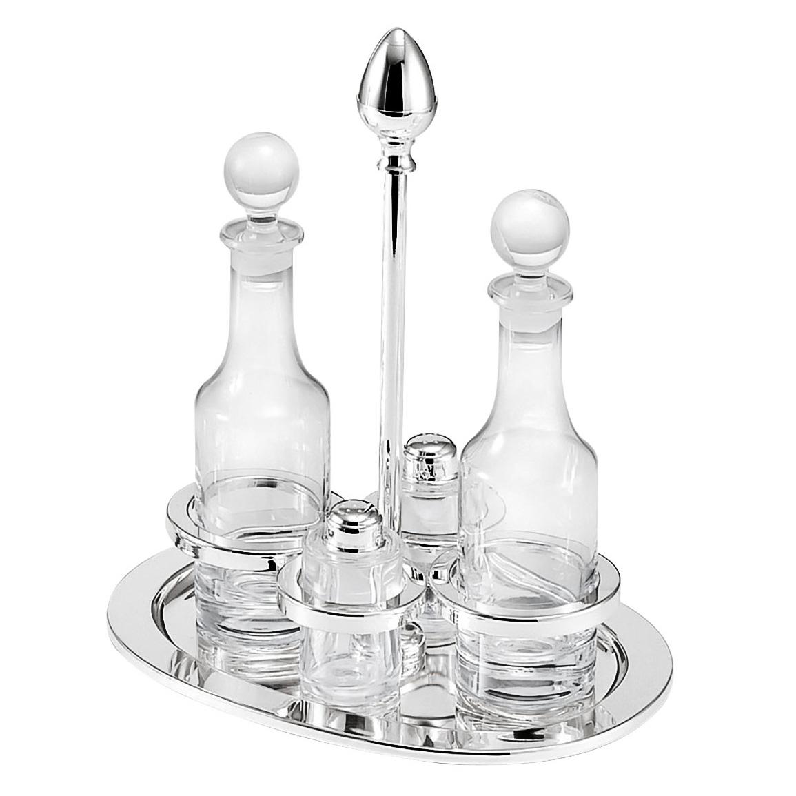 Servieren Sie italienische Eleganz mit der versilberten Ménagère "Carlotta" von Greggio. Das vierteilige Set umfasst je einen Salz- und Pfefferstreuer sowie je eine Flasche mit Glasverschluss für Essig und Öl. Alle Metallelemente sind makellos mit 999 Feinsilber versilbert. Das anmutige Design der Ménagère ist ebenso klassisch wie modern und harmoniert mit in jedem Einrichtungsstil.