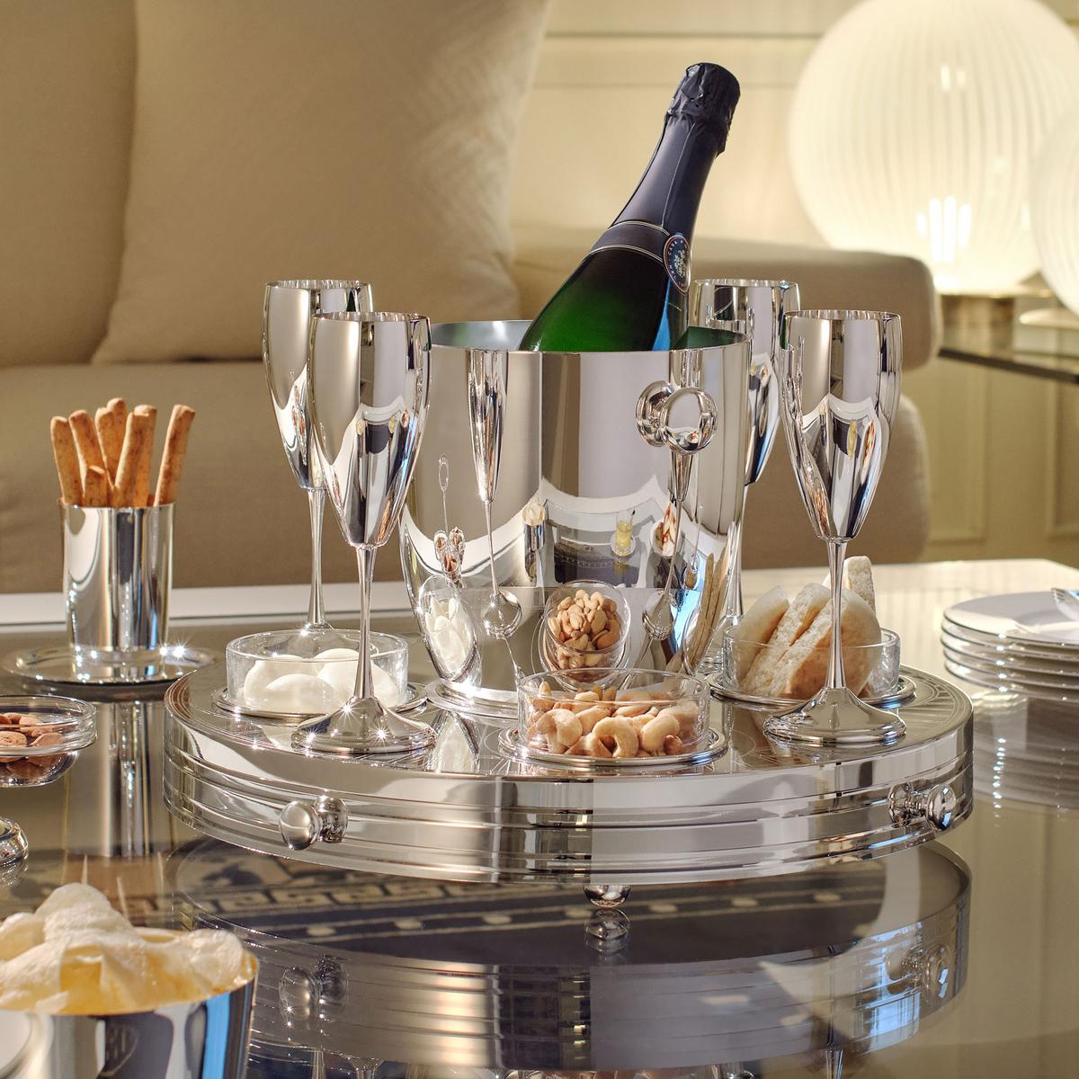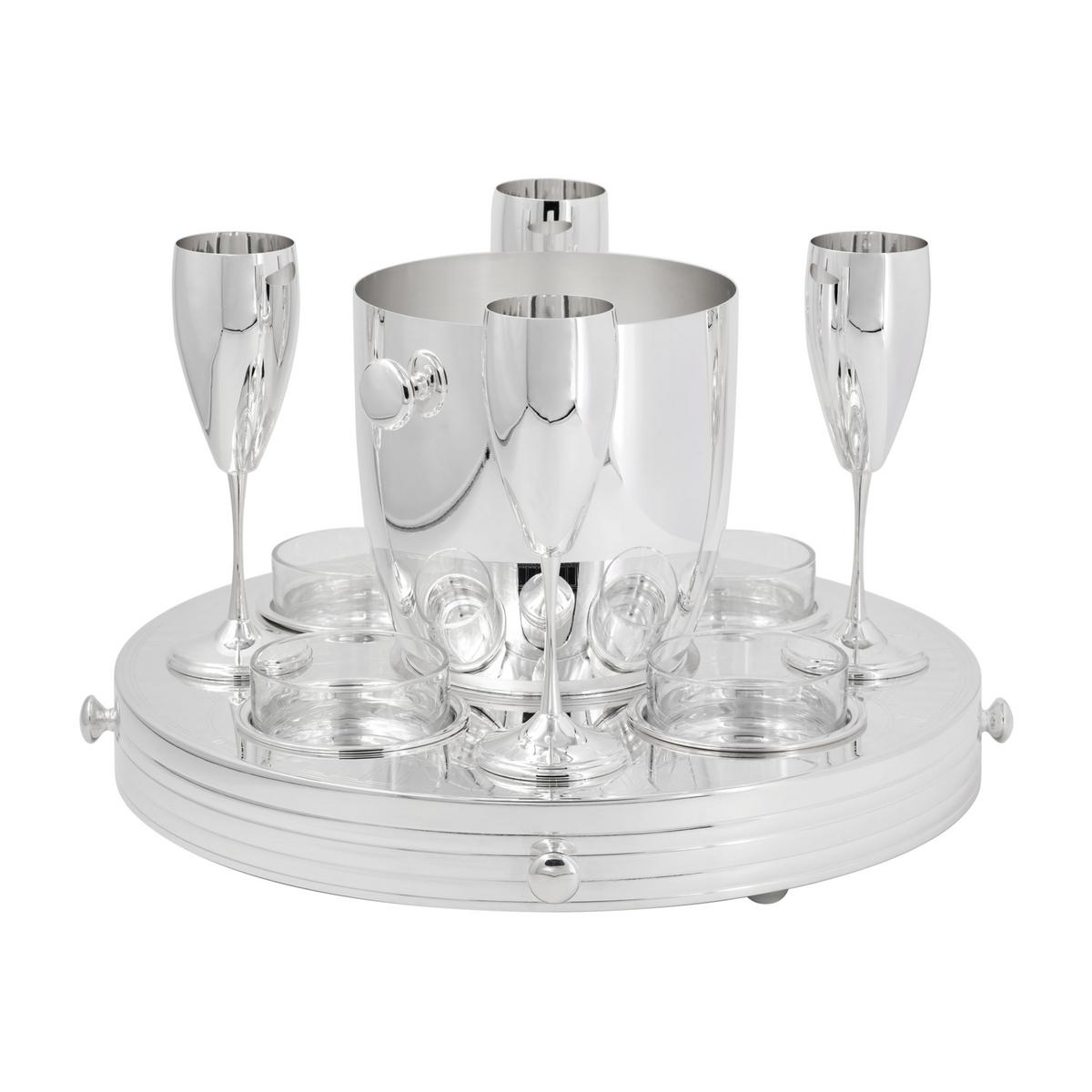 Das Set besteht aus einem Champagnerkühler, vier versilberten Champagnerflöten sowie vier Glasschalen, die sich ideal für Nüsse, Oliven oder kleine Aperitif-Häppchen eignen. Alle Elemente sind auf einer drehbaren Platte mit Griffen und Füßen angeordnet, sodass Getränke und Snacks bequem für alle Gäste erreichbar sind.