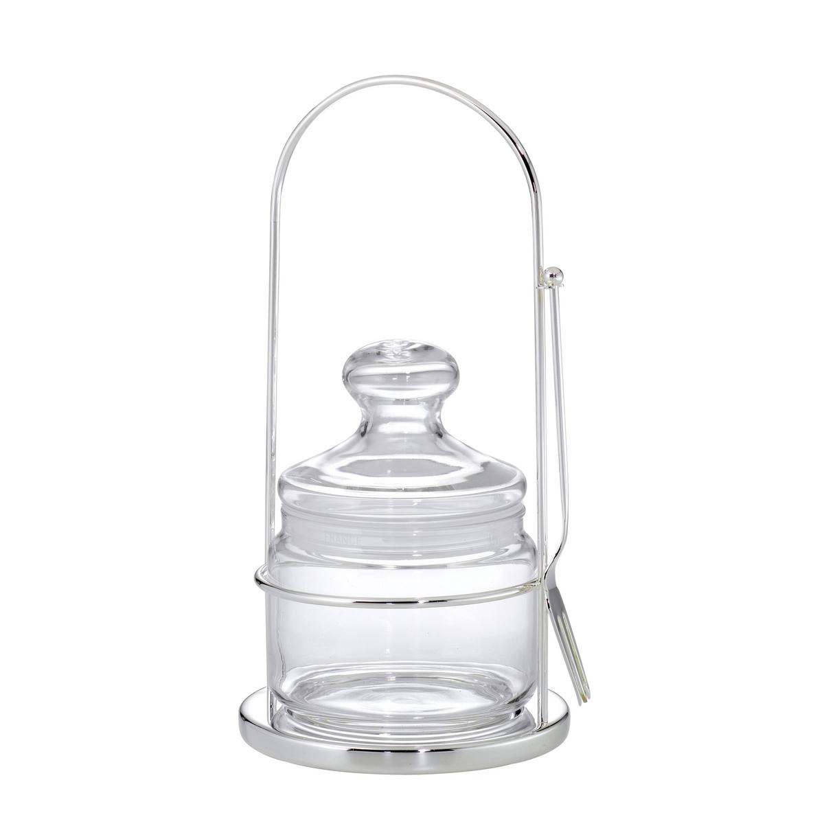 Das Servierglas "Marchesi" von Greggio verbindet elegante Tischkultur mit praktischer Funktionalität. Das klare Glasgefäß wird von einem versilberten Halter stilvoll eingefasst und mit einer passenden Serviergabel ergänzt, die seitlich angebracht ist und jederzeit griffbereit bleibt.