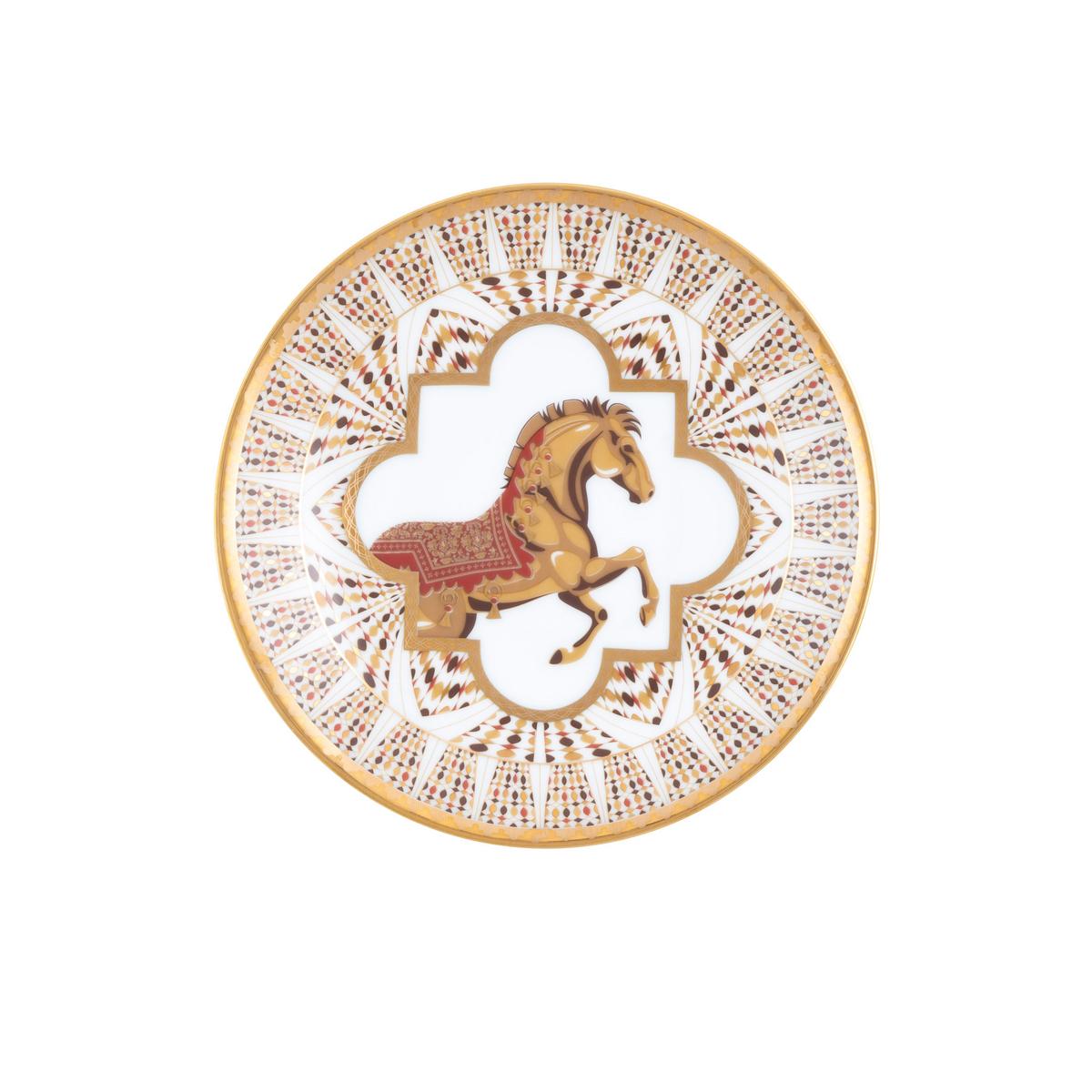 Das Leitmotiv der Kollektion ist ein im mittelalterlichen Stil als Zelter geschmückter Andalusier, eingerahmt von einem arabischen Maschrabiyya-Fenster. Neben der mehrfarbigen Ausführung auf den Platz- und Brottellern findet sich das Motiv auch in den schillernden Zierrändern und als Silhouette im Inneren der Tassen sowie auf den Untertassen. Die großzügigen Goldapplikationen beweisen die Eleganz und Raffinesse der Porzellanmanufaktur und erheben die Kollektion in die Exzellenz der modernen Tafelkultur.