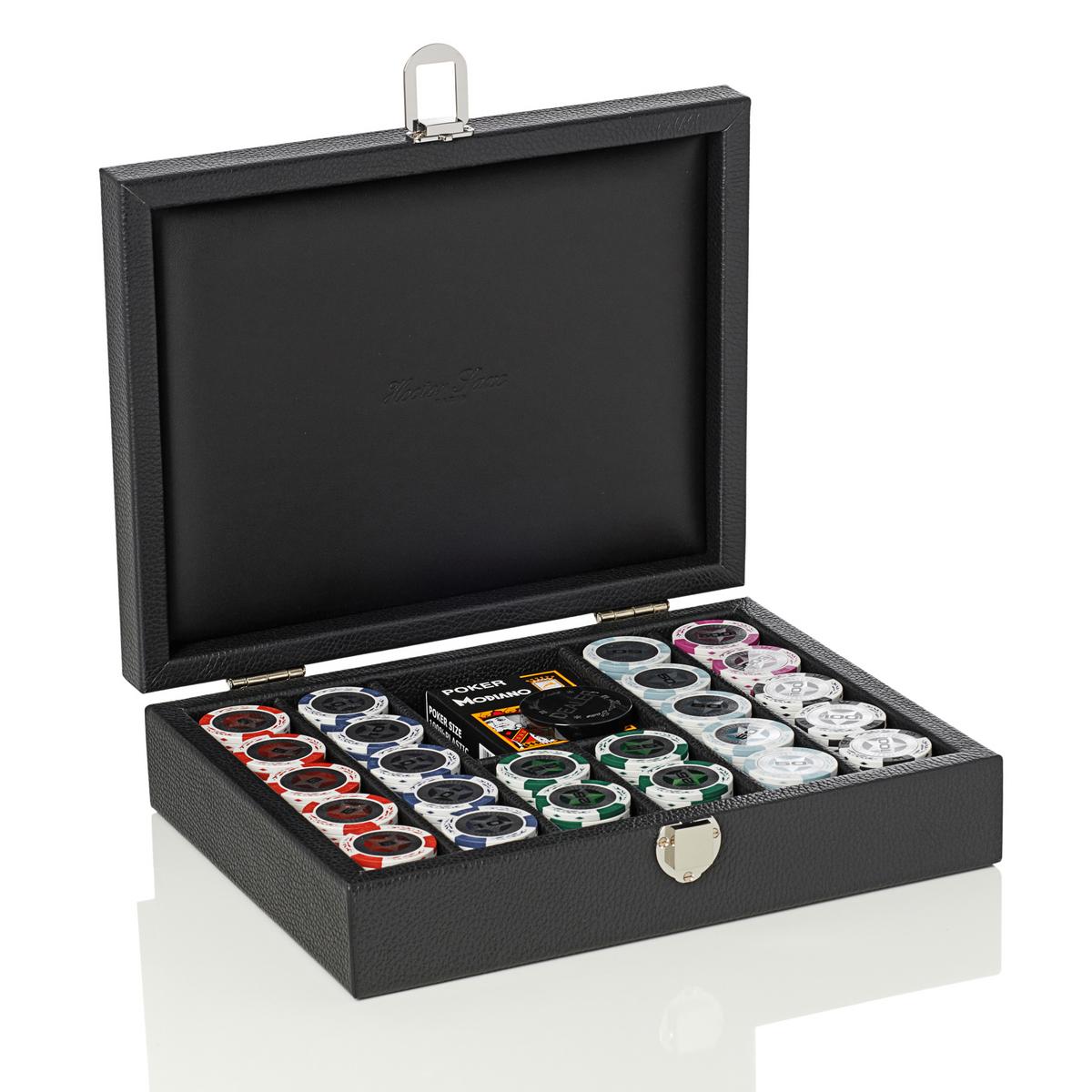 Garantiert kein Bluff. Die Pokerspielsets "Buffalo" von Hector Saxe sind aufsehenerregende Designerstücke für begeisterte Pokerspieler. Die kompakten Koffer sind innen und außen mit echtem Rindsleder in modischen Farben verkleidet. Im Koffer befinden sich 240 hochwertige, 13,5 Gramm schwere Clay-Chips und ein langlebiges Modiano Plastik-Kartendeck für Home Games in kleiner Runde. Die Werte der Chips sind 5, 10, 25, 50, 100, 500 und 1000. Zum stilvollen Präsentieren kann der Kofferdeckel geöffnet stehen bleiben.