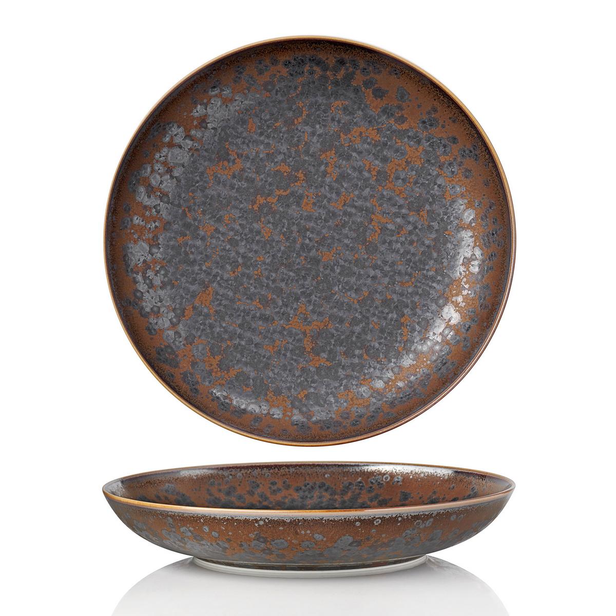 Porzellan im Industrial Look. Für das Tafelgeschirr "Aguirre" überzieht Jaune de Chrome das pure Limoges-Porzellan von J.L Coquet mit einem innovativen Dekor, das wie patiniertes Metall aussieht. Das Dekor ist weder gedruckt noch gemalt, sondern mit Sprühpistolen auf dem Rohporzellan aufgetragen. Es ist ein fester Bestandteil der Glasur und dadurch glänzend, glatt und kratzfest. Das macht die edlen Oberflächen genauso beeindruckend wie pflegeleicht. Ein Tafelservice wie aus einem Apokalypse-Film – Dinieren auf eigene Gefahr.
