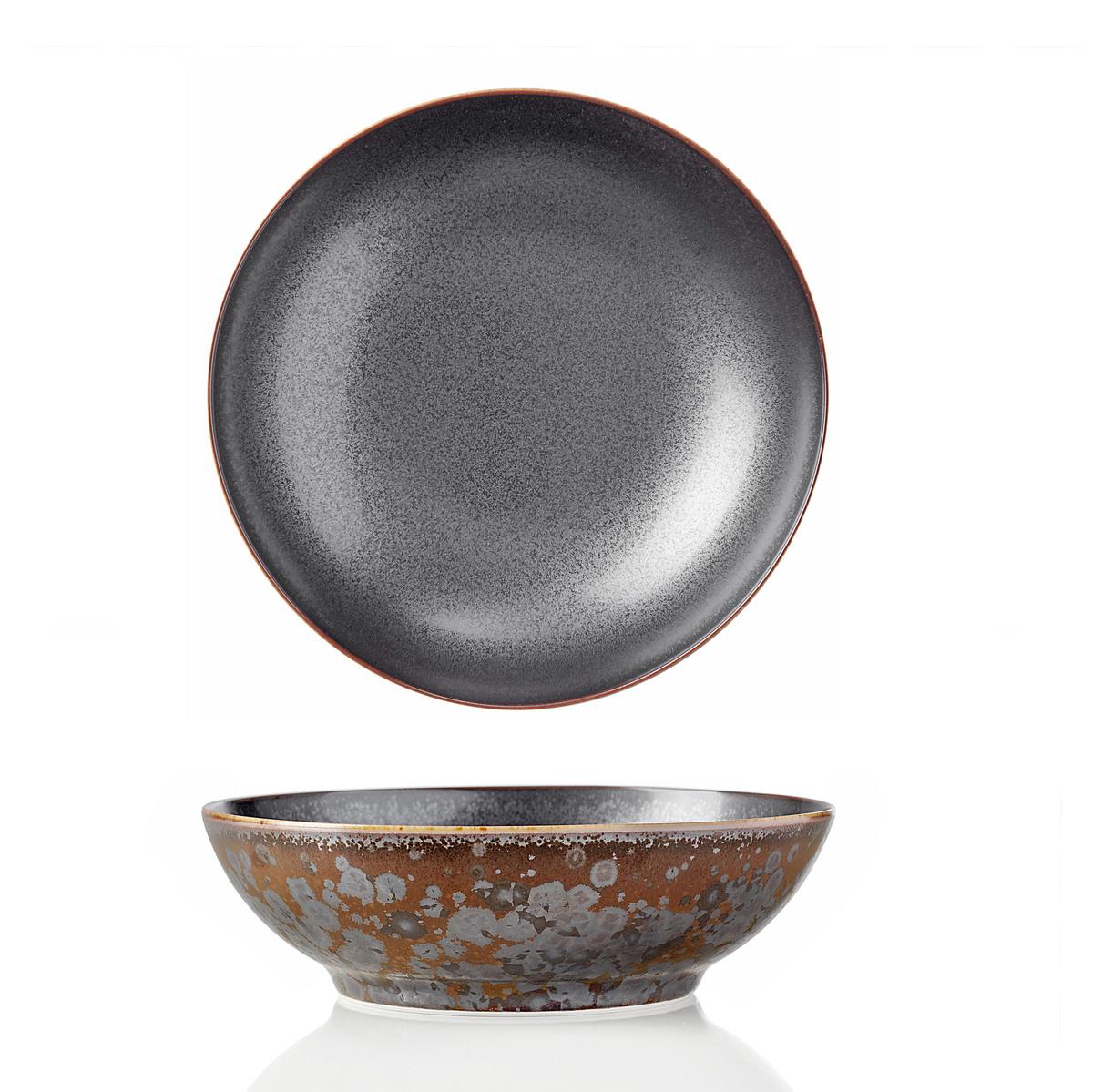 Porzellan im Industrial Look. Für das Tafelgeschirr "Aguirre" überzieht Jaune de Chrome das pure Limoges-Porzellan von J.L Coquet mit einem innovativen Dekor, das wie patiniertes Metall aussieht. Das Dekor ist weder gedruckt noch gemalt, sondern mit Sprühpistolen auf dem Rohporzellan aufgetragen. Es ist ein fester Bestandteil der Glasur und dadurch glänzend, glatt und kratzfest. Das macht die edlen Oberflächen genauso beeindruckend wie pflegeleicht. Ein Tafelservice wie aus einem Apokalypse-Film – Dinieren auf eigene Gefahr.