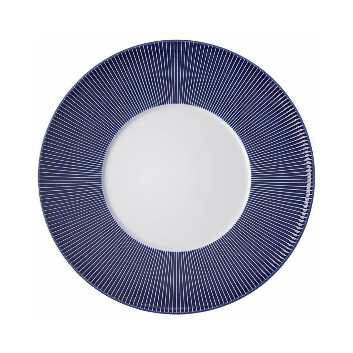 Blaues Porzellan mit Strahlkraft. Für das Tafelservice "Bolero Blue" veredelt Jaune de Chrome das strahlend weiße Limoges-Porzellan der Schwestermanufaktur J.L Coquet mit einer mitternachtsblauen Glasur. Das Merkmal der Bolero-Form sind feine Rillen, die strahlenförmig vom Rand in die Mitte zulaufen. Die speziell entwickelte Glasur von Jaune de Chrome sammelt sich zwischen den Rillen und kreiert ein elegantes Spiel aus Weiß und Blau, hell und dunkel, zart und intensiv. Formen ohne Strahlendekor leuchten in einem so tiefen Blau, dass man sich in ihnen verliert – meisterliche Glasur-Alchemie von Jaune de Chrome.