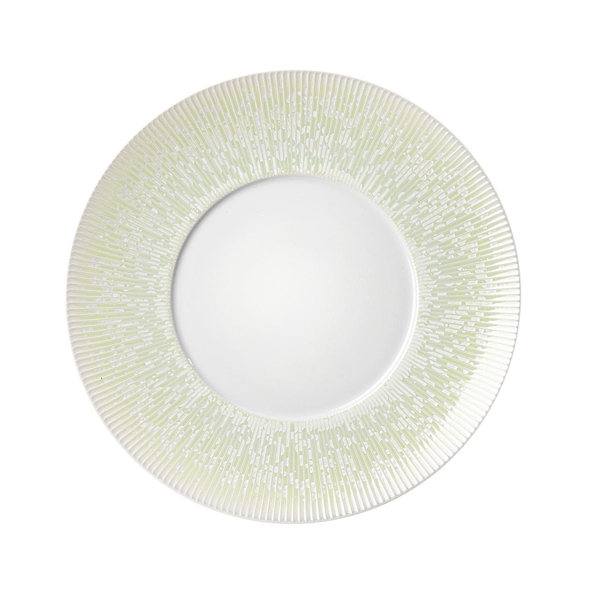 Zurückerobert von der Natur. Das Tafelservice "Song Amande" von Jaune de Chrome schimmert in einem sanften Grünton. Ein heller Fleckenteppich erstreckt sich wie ein edle Patina über das zart gefärbte Limoges-Porzellan. Zusammen mit einem dezenten, weichen Farbverlauf scheint es, als wäre das Geschirr wie Steine im Garten nach Jahren in der warmen Sonne langsam verblasst und von feinem Moos überwachsen.