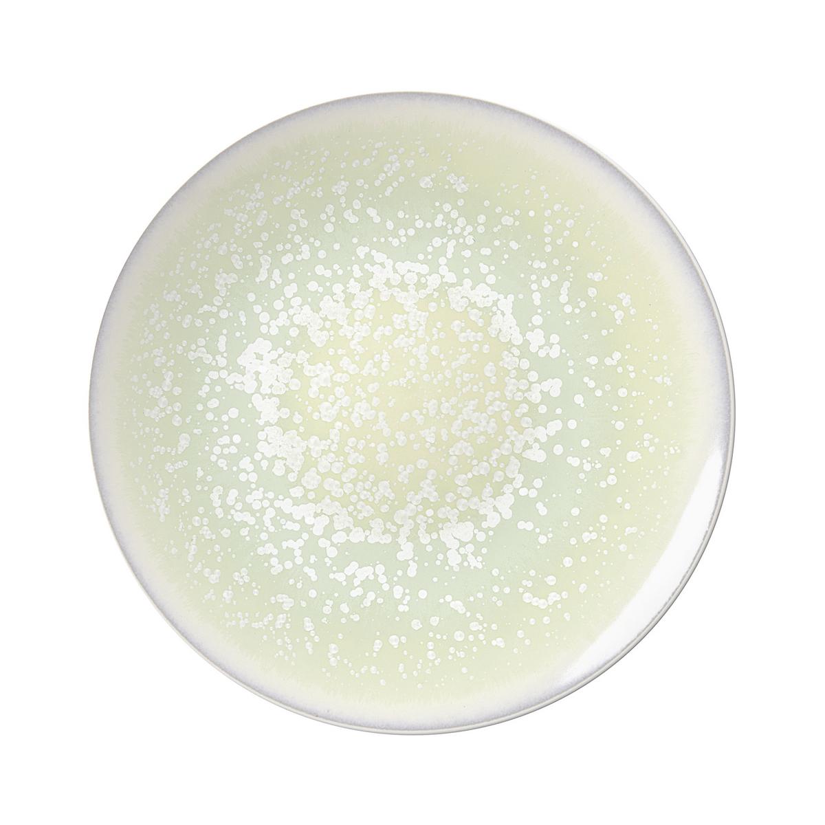 Zurückerobert von der Natur. Das Tafelservice "Song Amande" von Jaune de Chrome schimmert in einem sanften Grünton. Ein heller Fleckenteppich erstreckt sich wie ein edle Patina über das zart gefärbte Limoges-Porzellan. Zusammen mit einem dezenten, weichen Farbverlauf scheint es, als wäre das Geschirr wie Steine im Garten nach Jahren in der warmen Sonne langsam verblasst und von feinem Moos überwachsen.