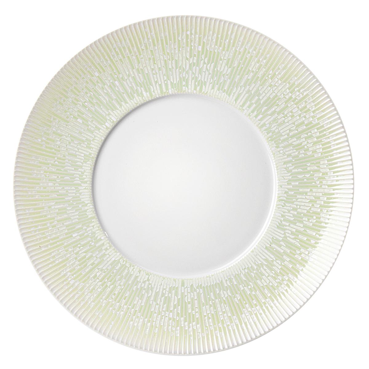 Zurückerobert von der Natur. Das Tafelservice "Song Amande" von Jaune de Chrome schimmert in einem sanften Grünton. Ein heller Fleckenteppich erstreckt sich wie ein edle Patina über das zart gefärbte Limoges-Porzellan. Zusammen mit einem dezenten, weichen Farbverlauf scheint es, als wäre das Geschirr wie Steine im Garten nach Jahren in der warmen Sonne langsam verblasst und von feinem Moos überwachsen.