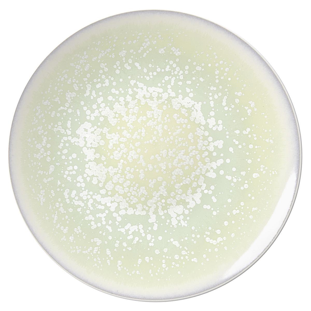 Zurückerobert von der Natur. Das Tafelservice "Song Amande" von Jaune de Chrome schimmert in einem sanften Grünton. Ein heller Fleckenteppich erstreckt sich wie ein edle Patina über das zart gefärbte Limoges-Porzellan. Zusammen mit einem dezenten, weichen Farbverlauf scheint es, als wäre das Geschirr wie Steine im Garten nach Jahren in der warmen Sonne langsam verblasst und von feinem Moos überwachsen.