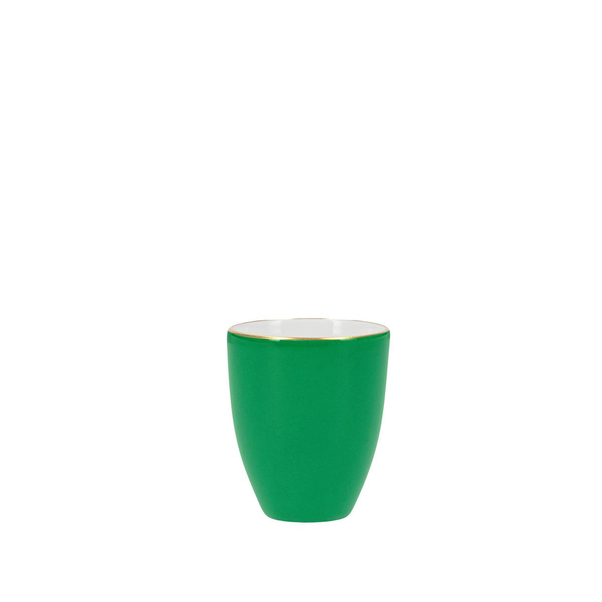 Ob in Dunkelpurpur, Eisenrot oder Zitronengelb – jedes Stück wird von Hand in der traditionellen Stupftechnik dekoriert und setzt einen eleganten Farbakzent. Gekrönt wird die verfeinerte Sachlichkeit durch eine elegante 24-karätige Goldlinie auf Rand und Henkel.