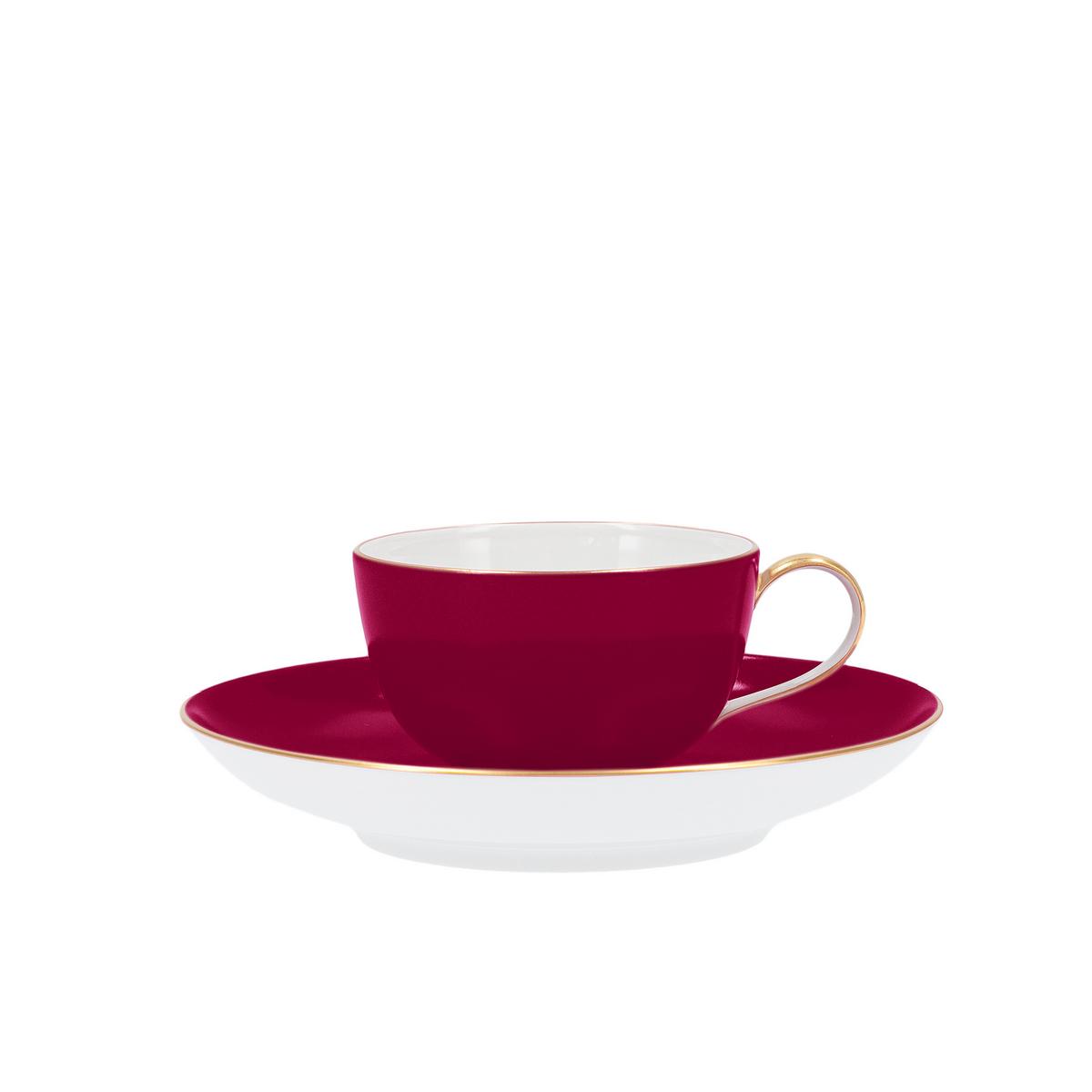 Ob in Dunkelpurpur, Eisenrot oder Zitronengelb – jedes Stück wird von Hand in der traditionellen Stupftechnik dekoriert und setzt einen eleganten Farbakzent. Gekrönt wird die verfeinerte Sachlichkeit durch eine elegante 24-karätige Goldlinie auf Rand und Henkel.