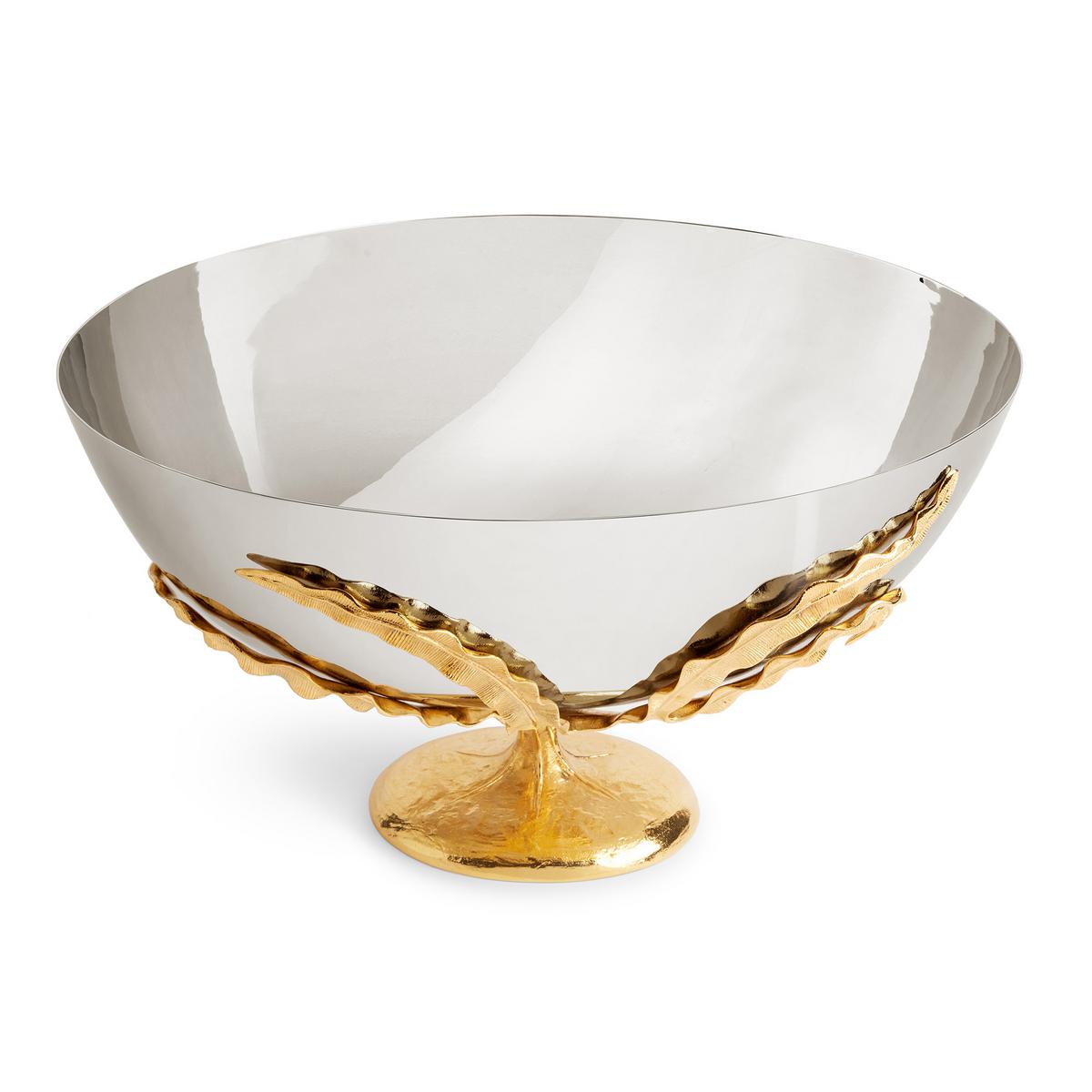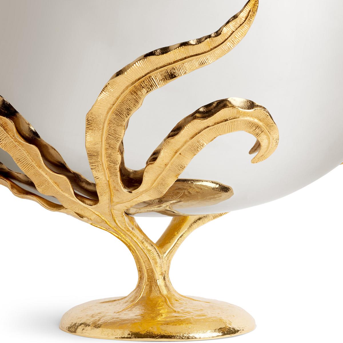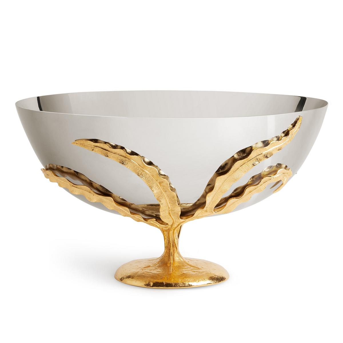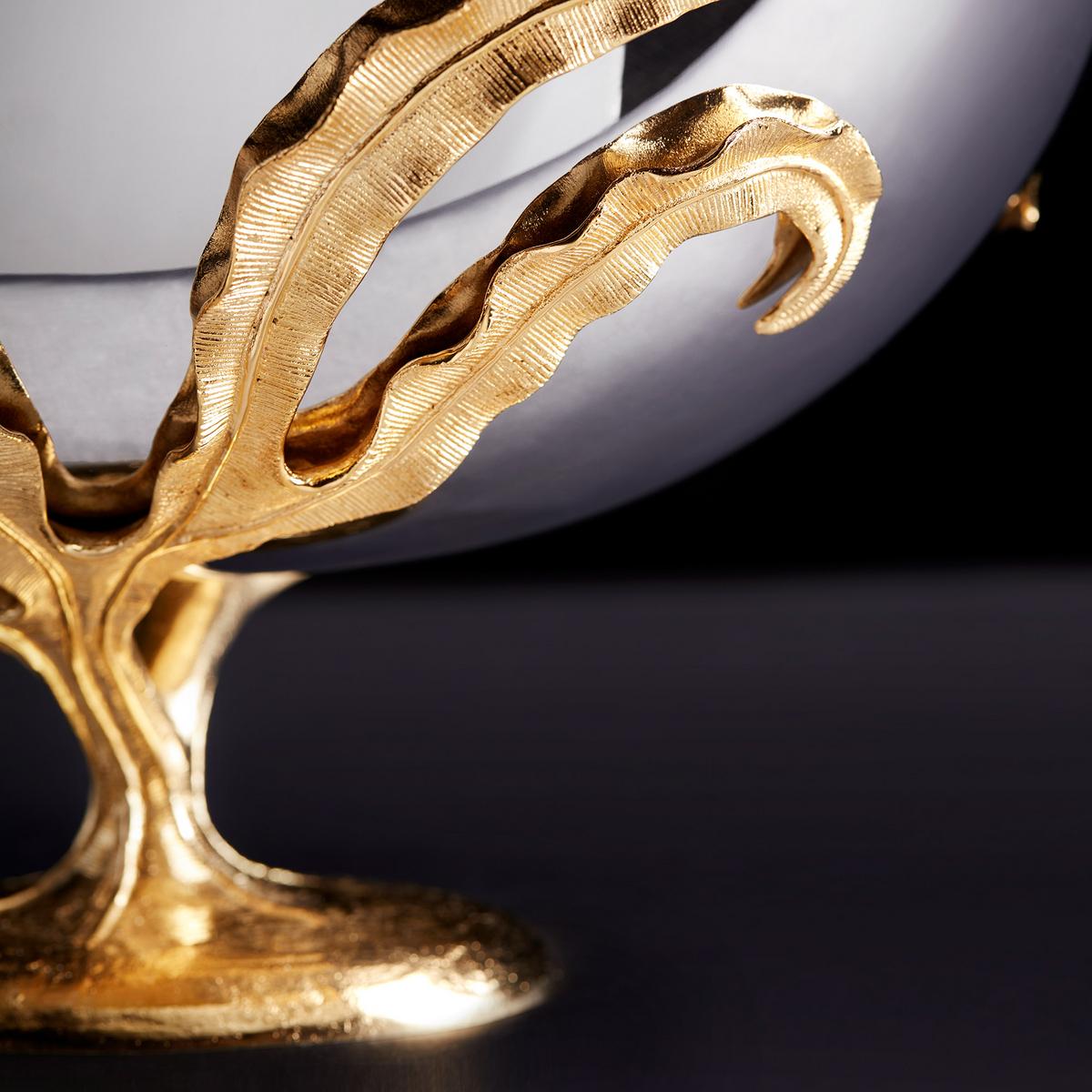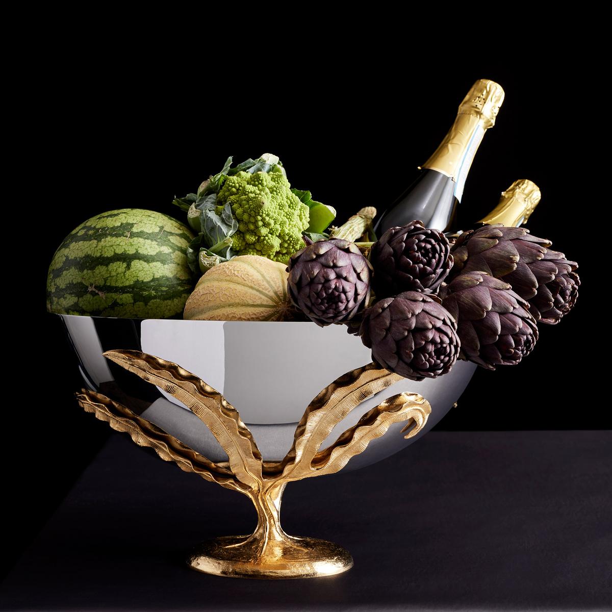 Eine Ode an die Eleganz der Natur. Die große Schale mit Fuß "Fern" von L’Objet ist ein zeitloses Design für die anspruchsvolle Tafel. Lange, vergoldete Farnblätter ranken sich um die sinnlichen Rundungen der handgefertigten Edelstahlschale und laufen raffiniert zusammen, um den Fuß der Schale zu formen. Mit einem Volumen von sechs Litern eignet sich die stilvolle Schale dazu, auch größere Mengen an frischem Obst und Gemüse mit vielfältigen Farben und Texturen zu präsentieren.