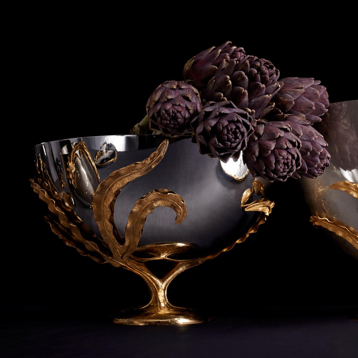 Die "Fern" Kollektion verewigt die stille Schönheit der Natur in einer perfekten Harmonie aus Edelstahl und 24 Karat Gold. Von Hand modellierte Farn-Motive umschlingen handgeschmiedete Elemente aus rostfreiem Edelstahl. Kleinste Details erfüllen das vergoldete Blattwerk mit Leben und verstärken die Kontraste zwischen den filigranen Zierelementen und den makellosen Metalloberflächen. Das ausgefallene Farn-Motiv wirkt vertraut und neu zugleich, weckt Assoziationen an die Antike und die Renaissance und erzählt doch seine eigene, neue Geschichte. Zeitlose Eleganz und Raffinesse für die moderne Tafel – der Inbegriff des Stils von L’Objet.