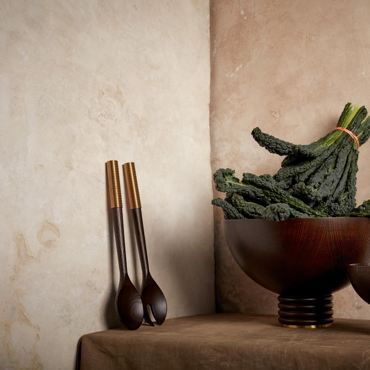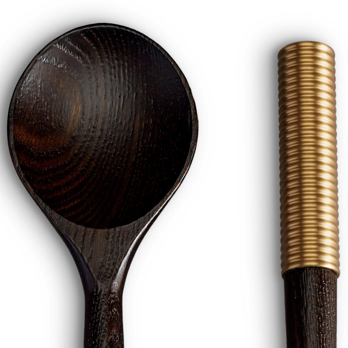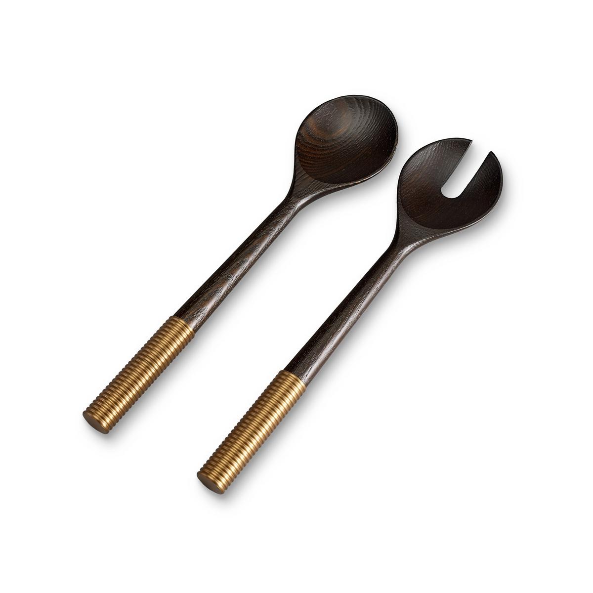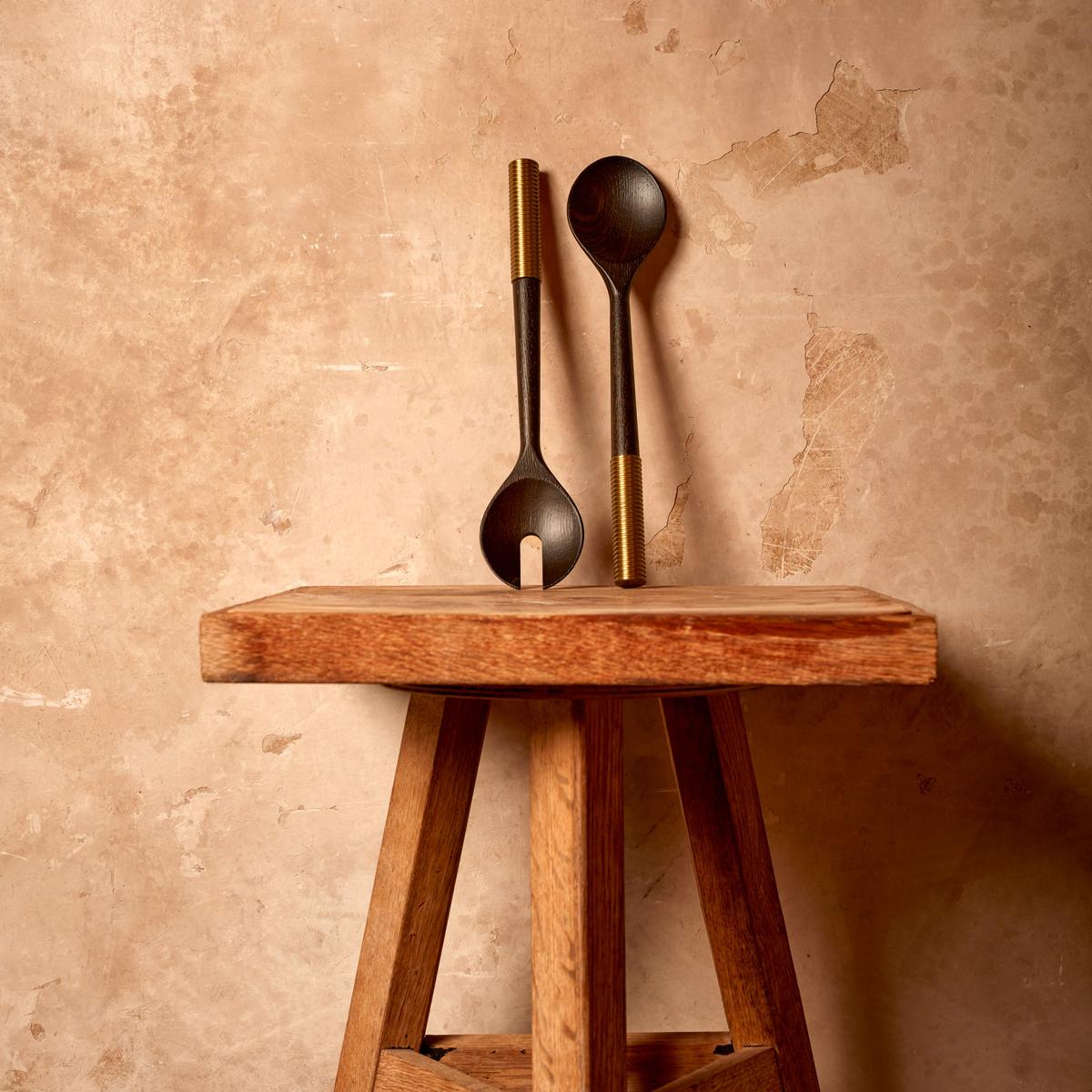 Das Salatbesteck "Alhambra" von L'Objet besteht aus feinem geräuchertem Eschenholz, das von Hand geschnitzt wurde und eine natürliche Maserung aufweist. Die Griffe sind mit edlen Messingakzenten verziert, die an die maurische Architektur der Alhambra erinnern.