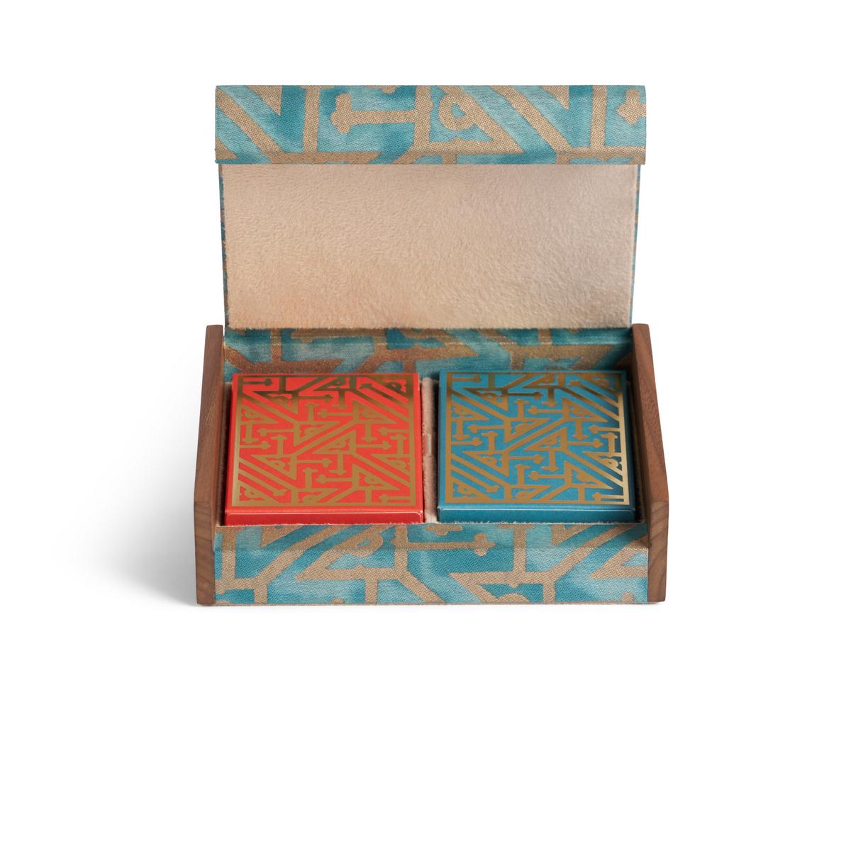 Die Karten sind mit vergoldeten Heißprägungen auf beiden Seiten veredelt und ruhen in einer edlen Box aus Walnussholz, die mit Fortuny-Stoff bezogen und innen mit Wildleder ausgekleidet ist. Ein stilvolles Sammlerstück, das Spiel und Ästhetik in vollendeter Form vereint.
