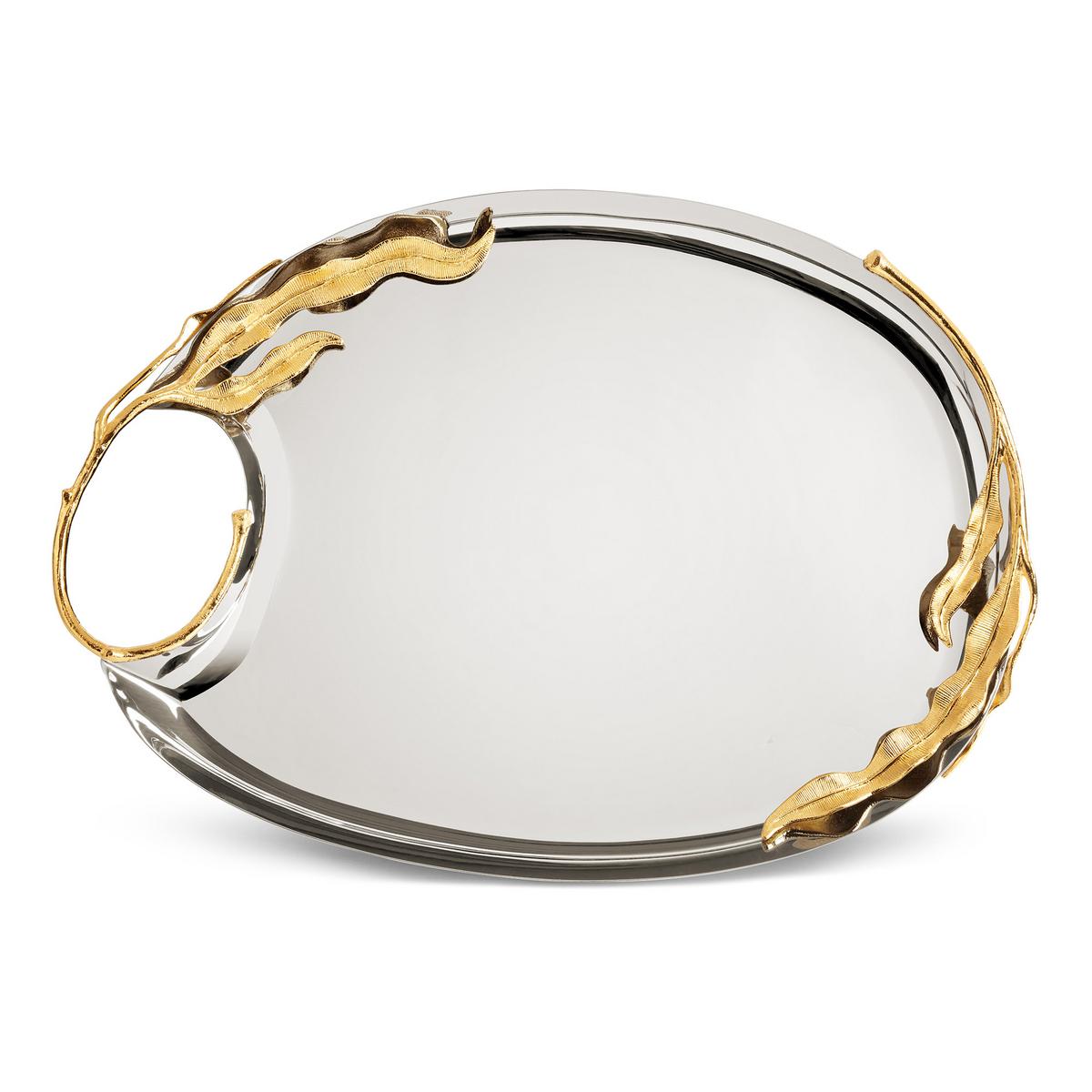 Eine Ode an die Eleganz der Natur. Die Tabletts "Fern" von L’Objet sind zeitlose Designerstücke für die anspruchsvolle Tafel. Lange, vergoldete Farn-Ornamente ranken sich schwungvoll um die sinnlichen Rundungen der handgefertigten Edelstahltabletts. Auf den größeren Ausführungen der Tabletts formen die Ornamente raffiniert einen Griff zum leichteren Tragen. Präsentieren und servieren Sie auf den Tabletts je nach Größe Butter, Aufstriche und Gewürze, kleine Schälchen oder Gläser und Getränke für unvergessliche Momente an der gedeckten Tafel.