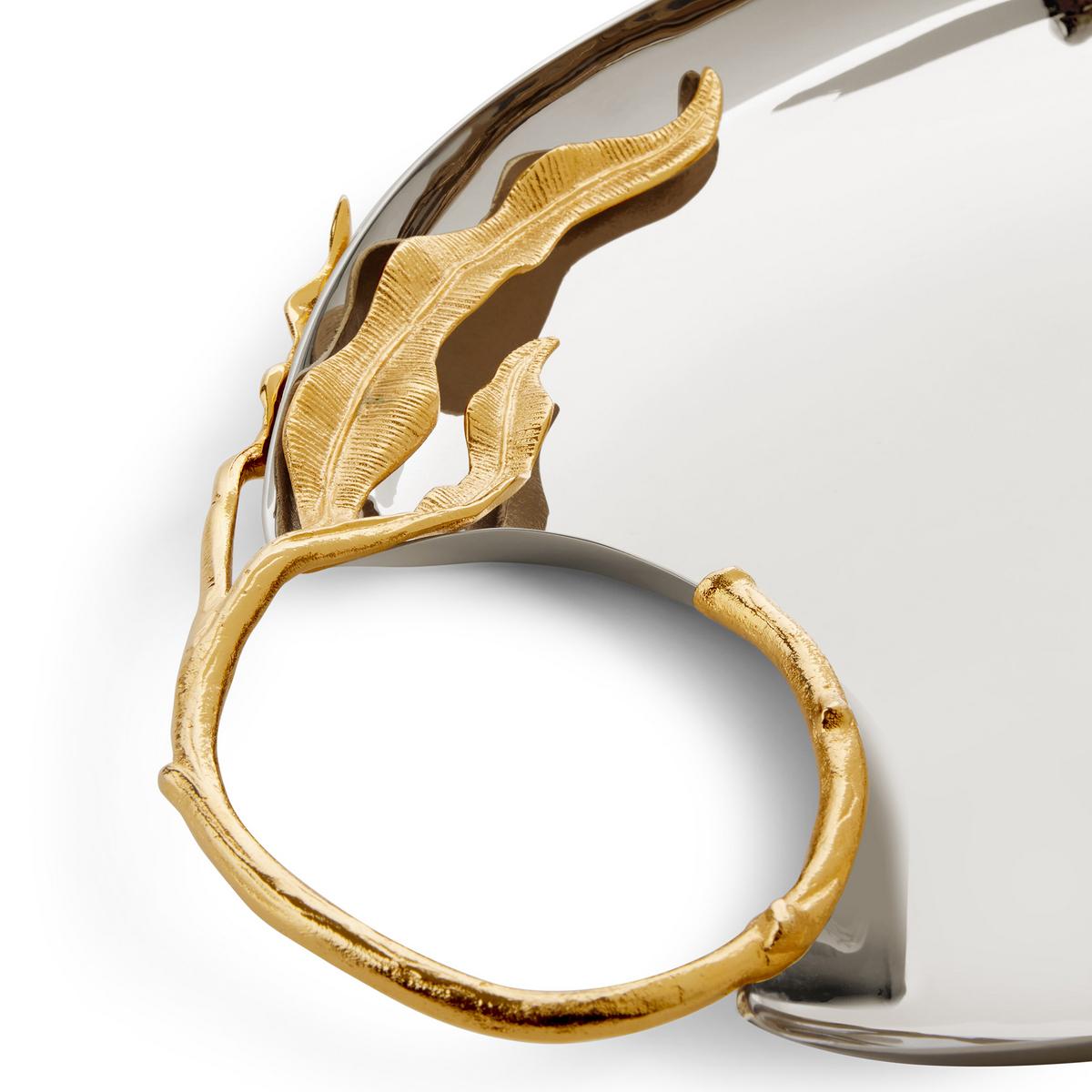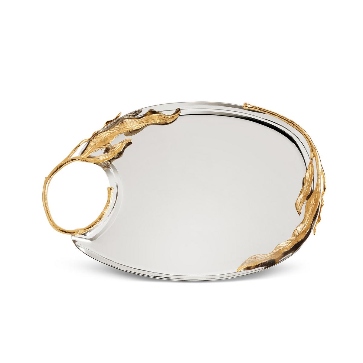 Eine Ode an die Eleganz der Natur. Die Tabletts "Fern" von L’Objet sind zeitlose Designerstücke für die anspruchsvolle Tafel. Lange, vergoldete Farn-Ornamente ranken sich schwungvoll um die sinnlichen Rundungen der handgefertigten Edelstahltabletts. Auf den größeren Ausführungen der Tabletts formen die Ornamente raffiniert einen Griff zum leichteren Tragen. Präsentieren und servieren Sie auf den Tabletts je nach Größe Butter, Aufstriche und Gewürze, kleine Schälchen oder Gläser und Getränke für unvergessliche Momente an der gedeckten Tafel.
