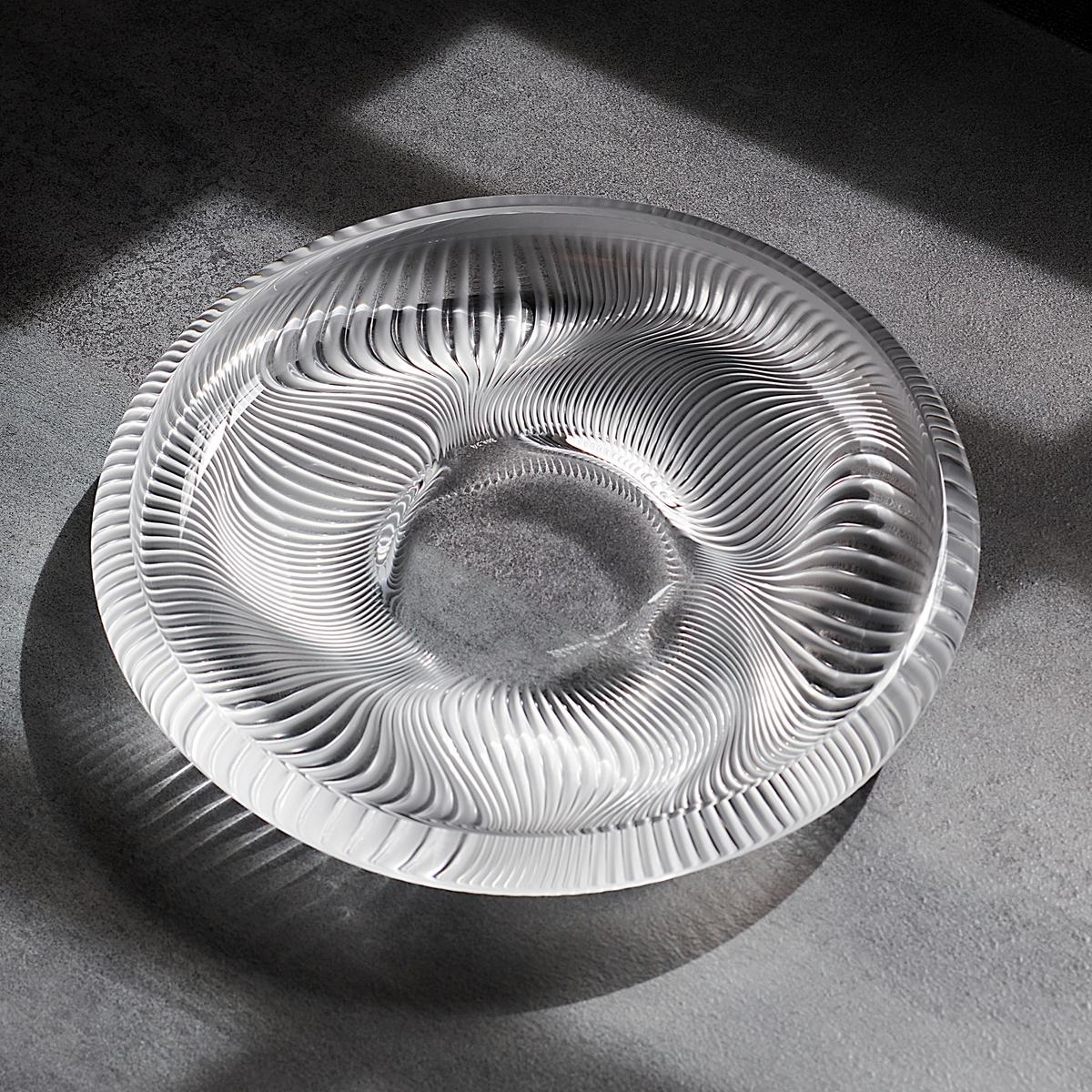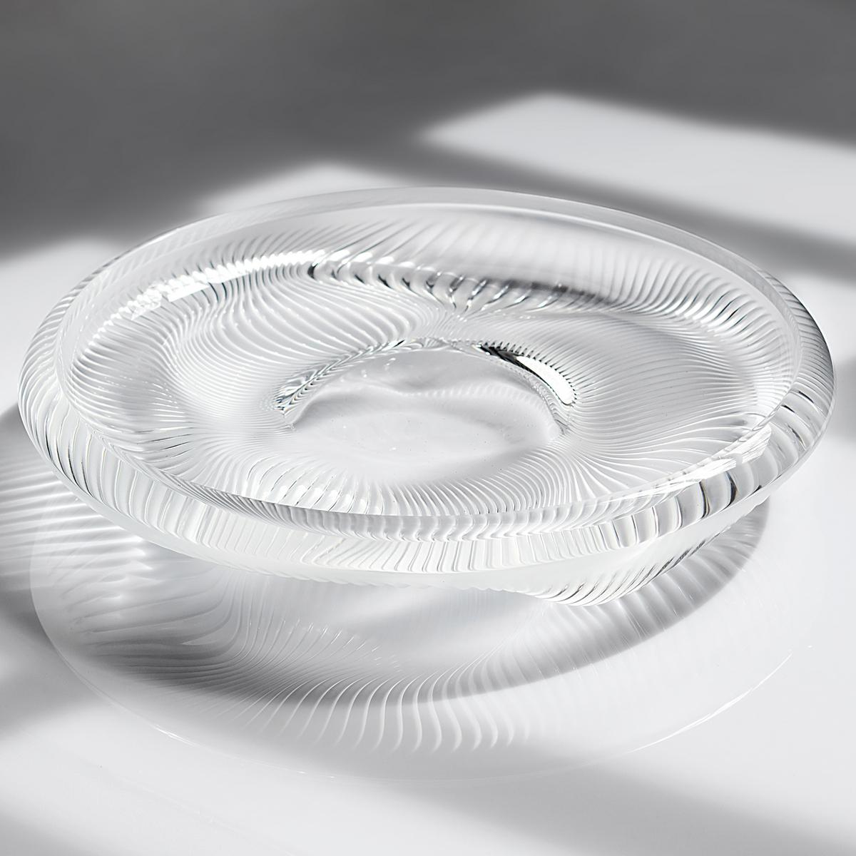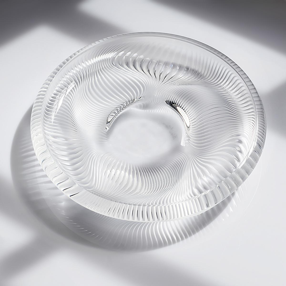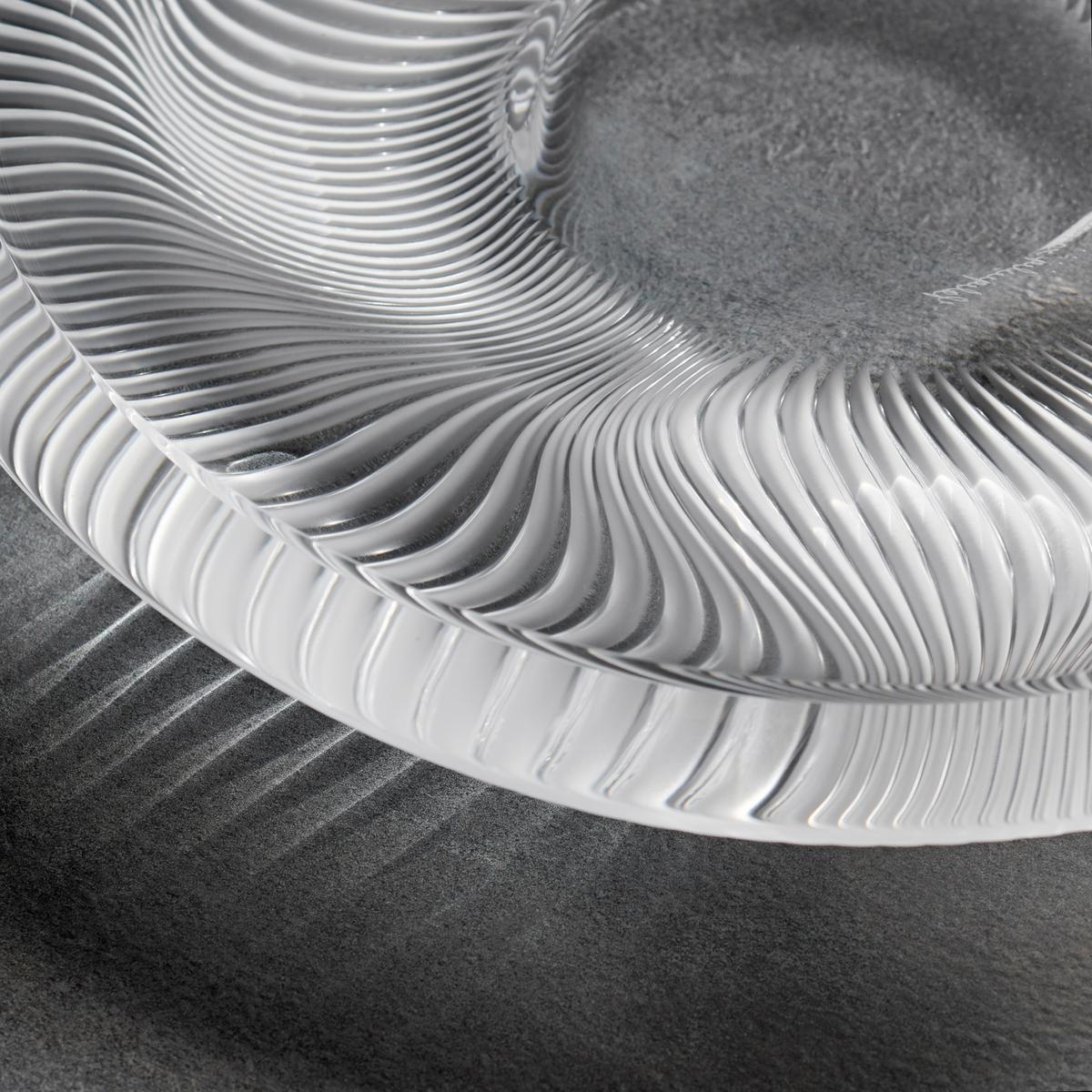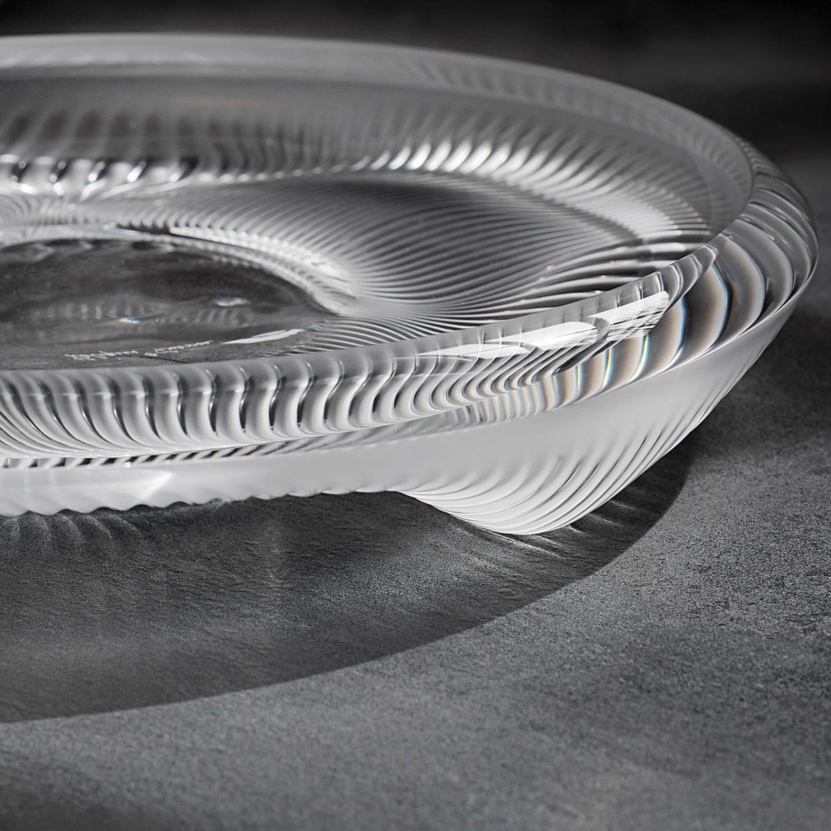 Die Schale "Alizé“ von Lalique übersetzt die poetische Bewegung einer sanften Brise in eine ausdrucksstarke, skulpturale Form. Ihr besonderes Merkmal offenbart sich im unteren Bereich: Das fein ausgearbeitete Relief aus fließenden, wellenartigen Linien befindet sich ausschließlich im Unterteil der Schale, während die obere Fläche glatt und klar gehalten ist.