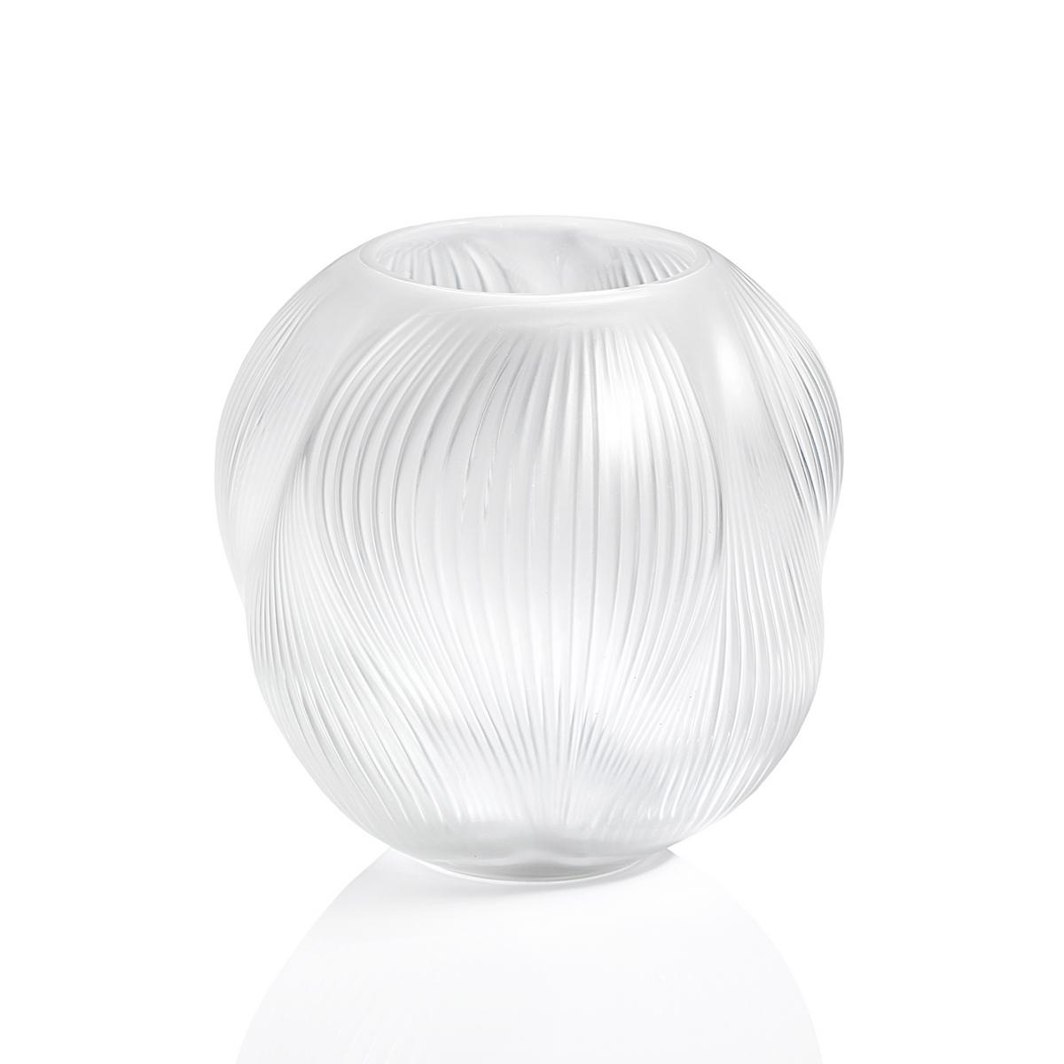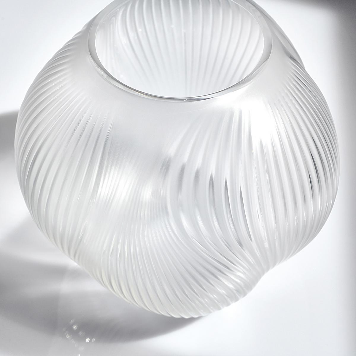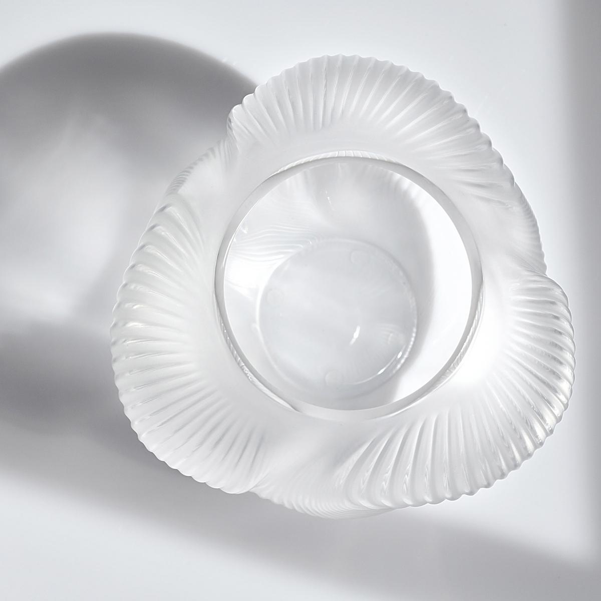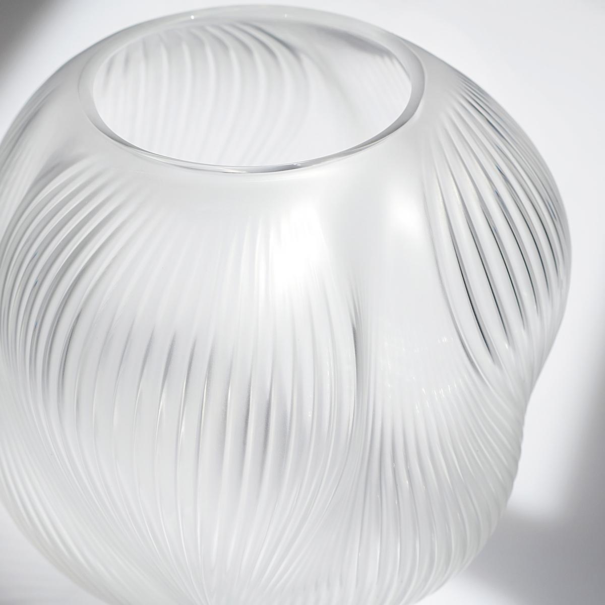 Das satinierte und anschließend polierte Kristallglas bringt die Struktur eindrucksvoll zur Geltung: Das Licht gleitet über die Oberfläche, bricht sich in den geschwungenen Linien und lässt das Dekor in subtiler Bewegung erscheinen. So entsteht ein faszinierendes Spiel aus Mattheit und Glanz, das die luftige Eleganz der Form unterstreicht.