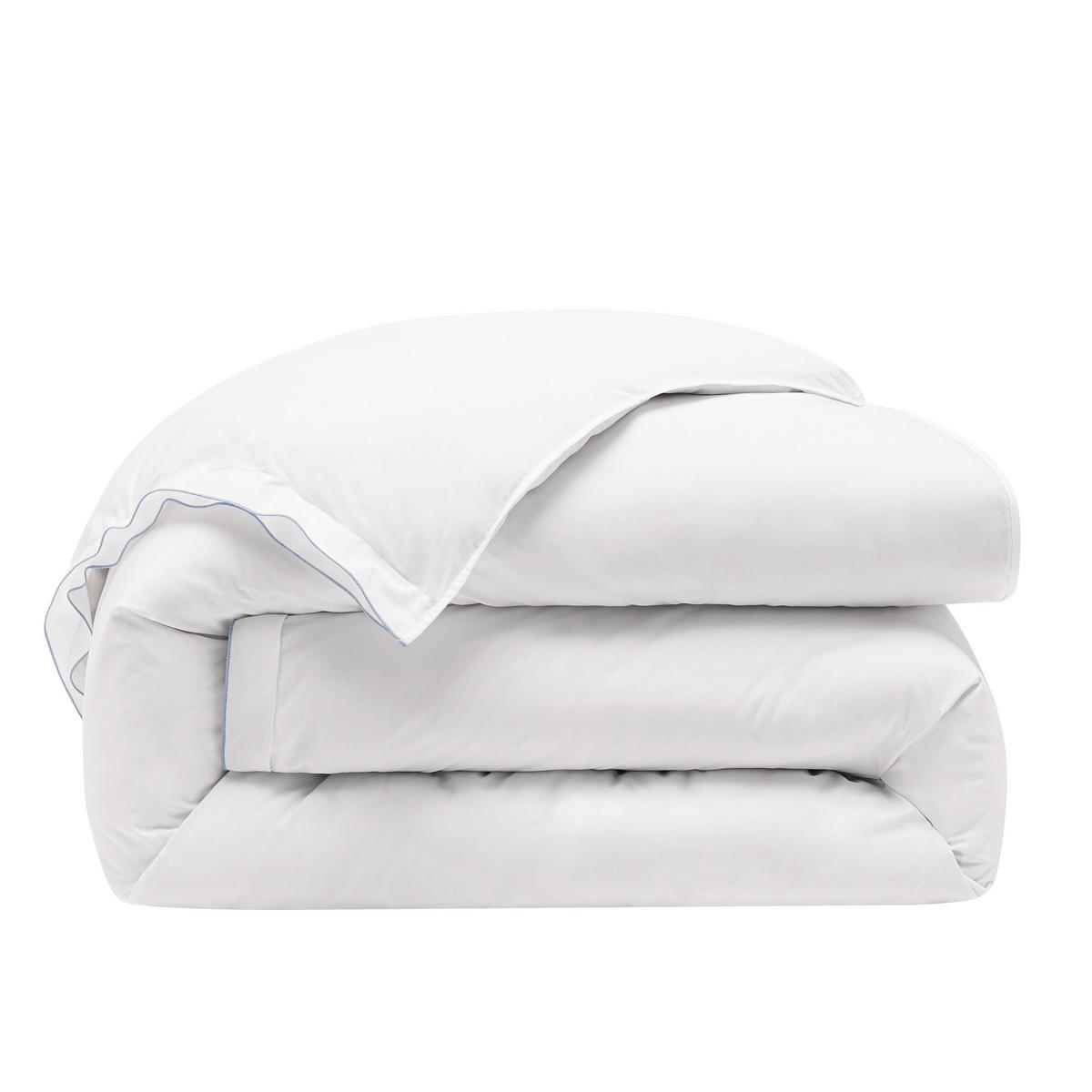 Modern und frisch: Die Bettwäsche "Songe" von Le Jacquard Francais mit doppeltem Stehsaum lässt sich unendlich variieren. Eine feine blaue Kordelnaht erfrischt diese zeitlose Bettwäsche aus Perkalbaumwolle.