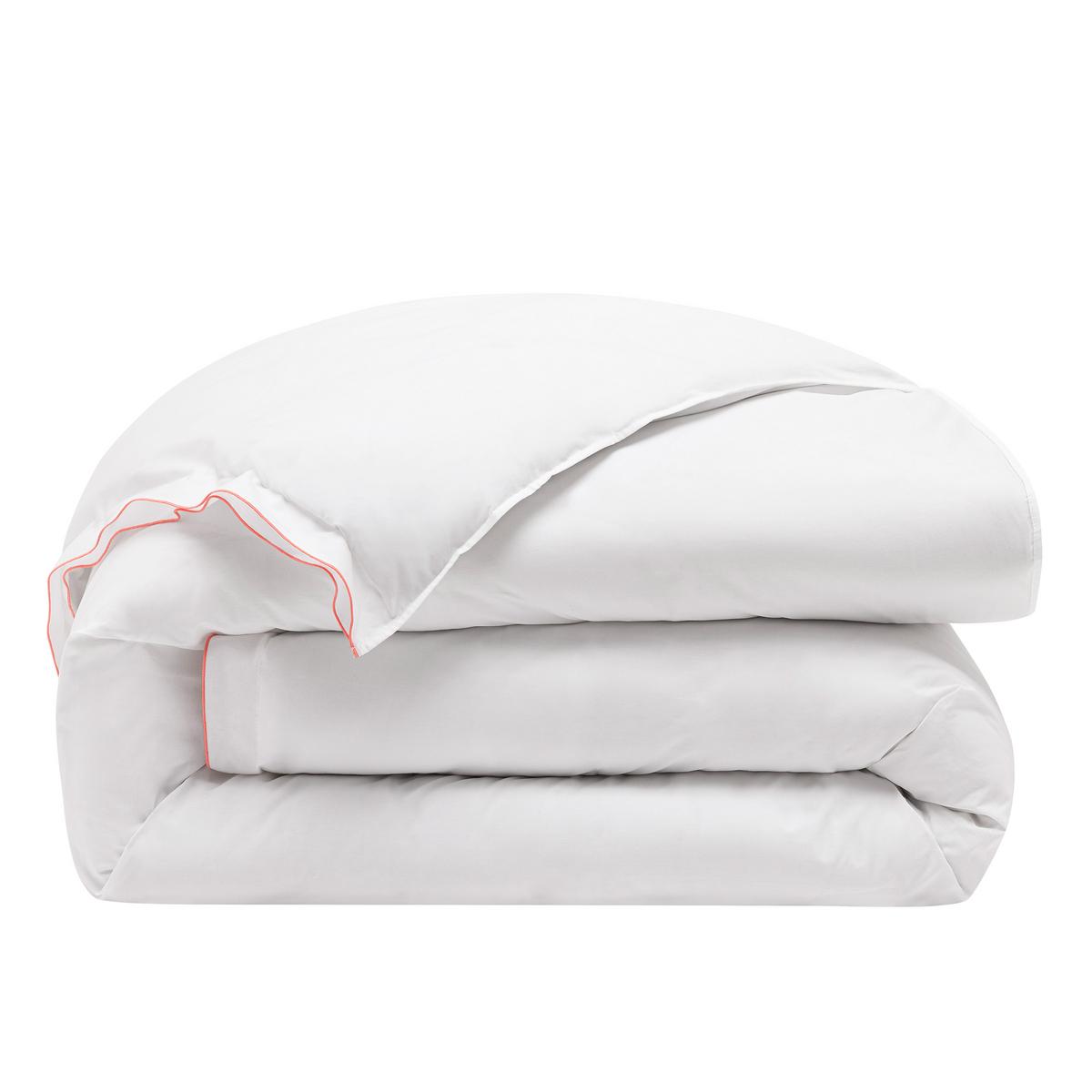 Modern und frisch: Die Bettwäsche "Songe" von Le Jacquard Francais mit doppeltem Stehsaum lässt sich unendlich variieren. Eine feine korallenrote Kordelnaht erfrischt diese zeitlose Bettwäsche aus Perkalbaumwolle.