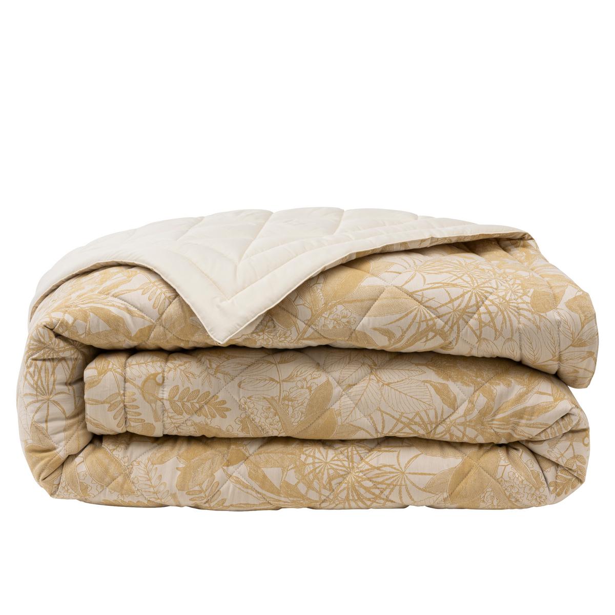 Die gesteppte Tagesdecke und die passenden Kissenhüllen "Bois Dormant" von Le Jacquard Français ergänzen die gleichnamige Bettwäsche-Kollektion und bringen luxuriöse Harmonie ins Schlafzimmer. Der edle Stoff aus feinster ägyptischer Baumwolle in Jacquard-Webung zeigt ein detailreiches Blatt- und Vogelmotiv in Elfenbein und Goldgelb.