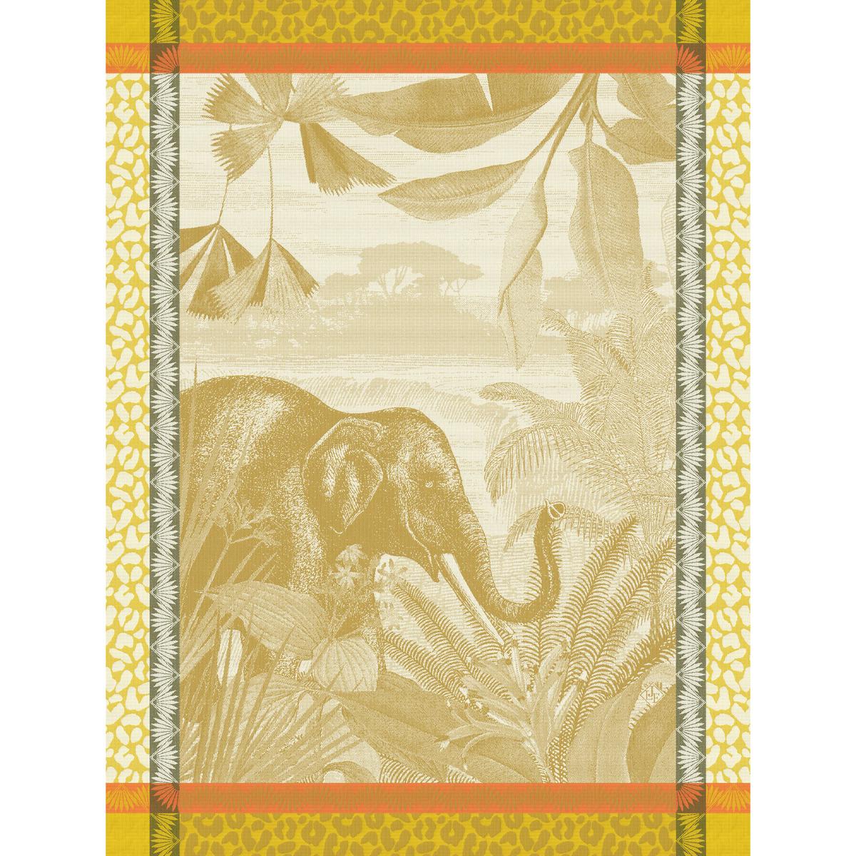 Ein majestätischer Elefant zieht in sanften Ton-in-Ton-Nuancen über das Gewebe der Geschirrtücher "Sinharaja" von Le Jacquard Francais und erinnert an die Ruhe und Schönheit tropischer Landschaften. Inspiriert von der Vielfalt Sri Lankas – von Teeplantagen bis zu üppigem Dschungel – bringt dieses Design einen Hauch Exotik in die Küche.