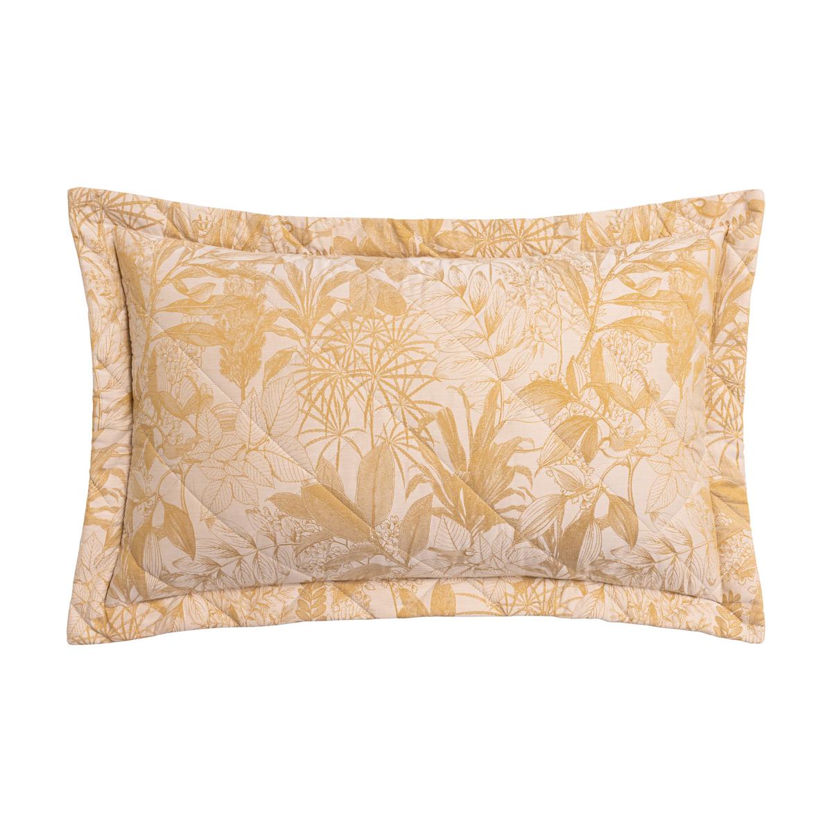 Die gesteppte Tagesdecke und die passenden Kissenhüllen "Bois Dormant" von Le Jacquard Français ergänzen die gleichnamige Bettwäsche-Kollektion und bringen luxuriöse Harmonie ins Schlafzimmer. Der edle Stoff aus feinster ägyptischer Baumwolle in Jacquard-Webung zeigt ein detailreiches Blatt- und Vogelmotiv in Elfenbein und Goldgelb.