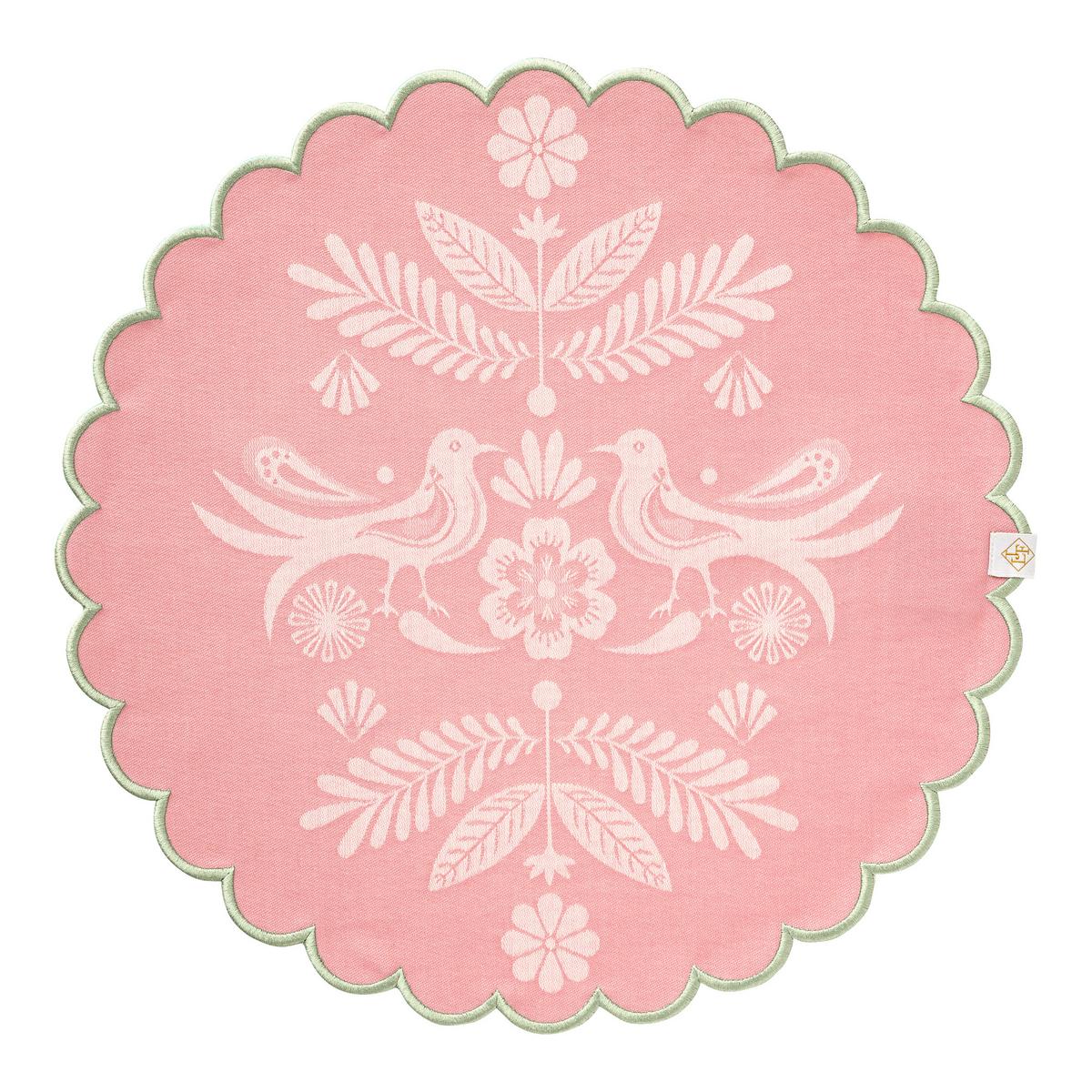 Die Serviette und das runde Platzset werden kunstvoll im Jacquardverfahren aus 100 % Baumwolle gewebt. Der kontrastierende Muschelsaum setzt einen dekorativen Akzent und verleiht jedem Stück eine lebendige, elegante Note.
