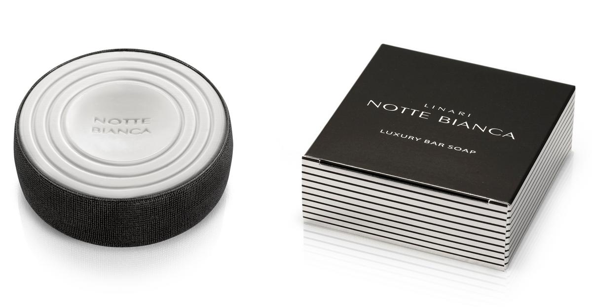 Die Luxusseifen gibt es in den Farben weiß und schwarz. Zusätzlich sind die Namen der sieben verschiedenen Duftnoten in den Seifenkörper geprägt. Die Düfte der luxuriösen Seifen sind genau passend zur erfolgreichen Linari Eau de Parfum Serie.