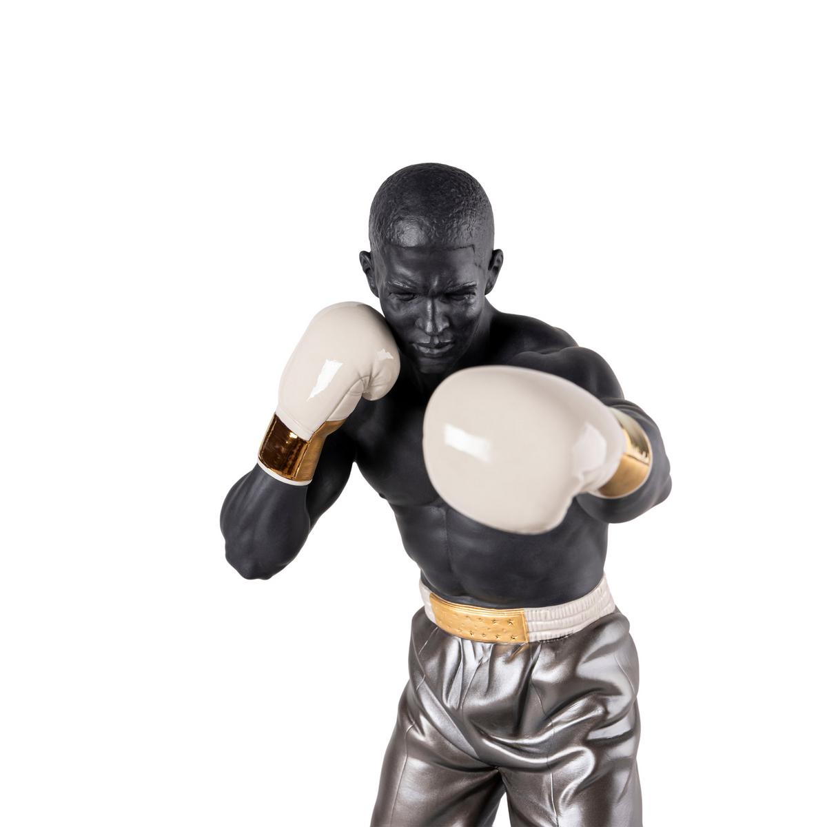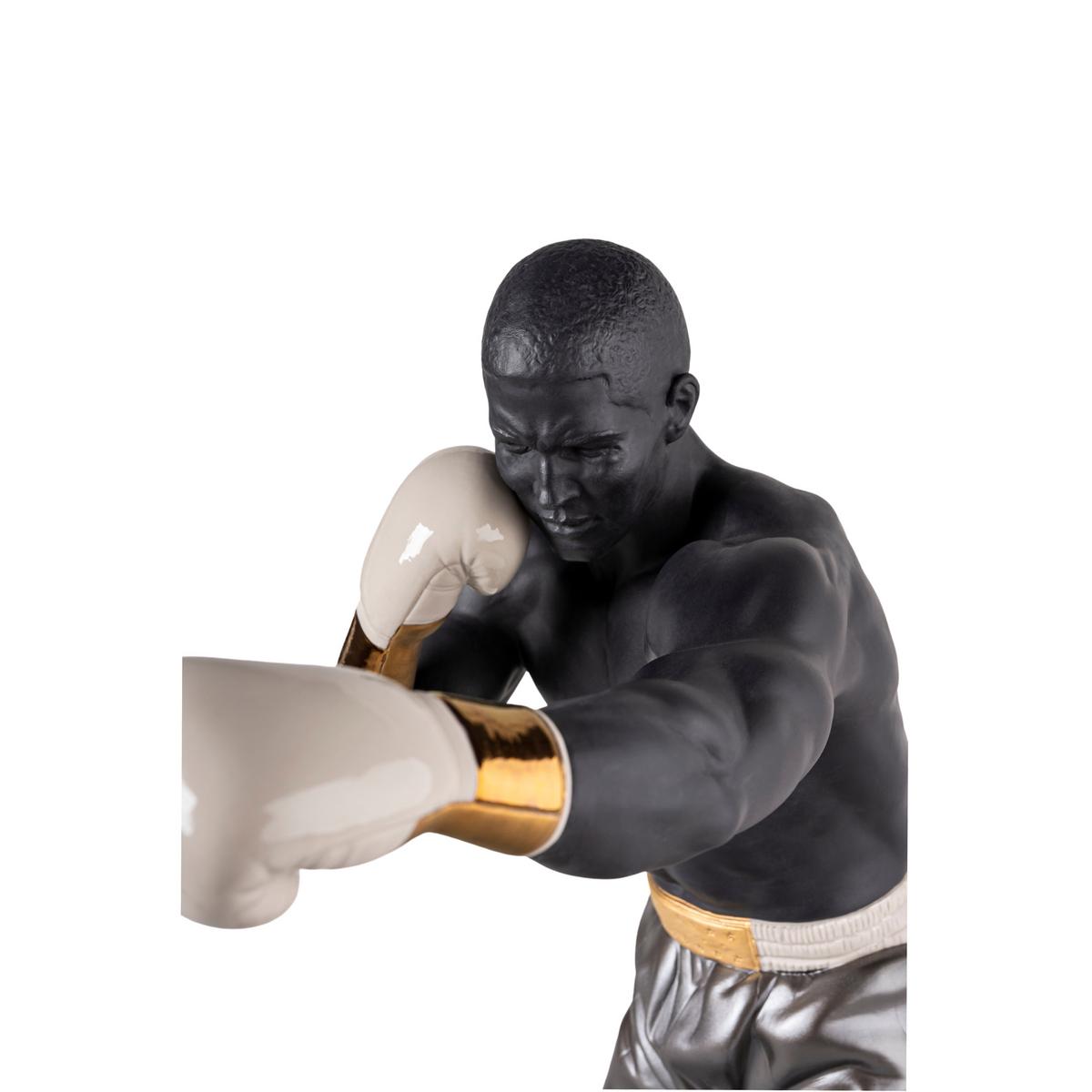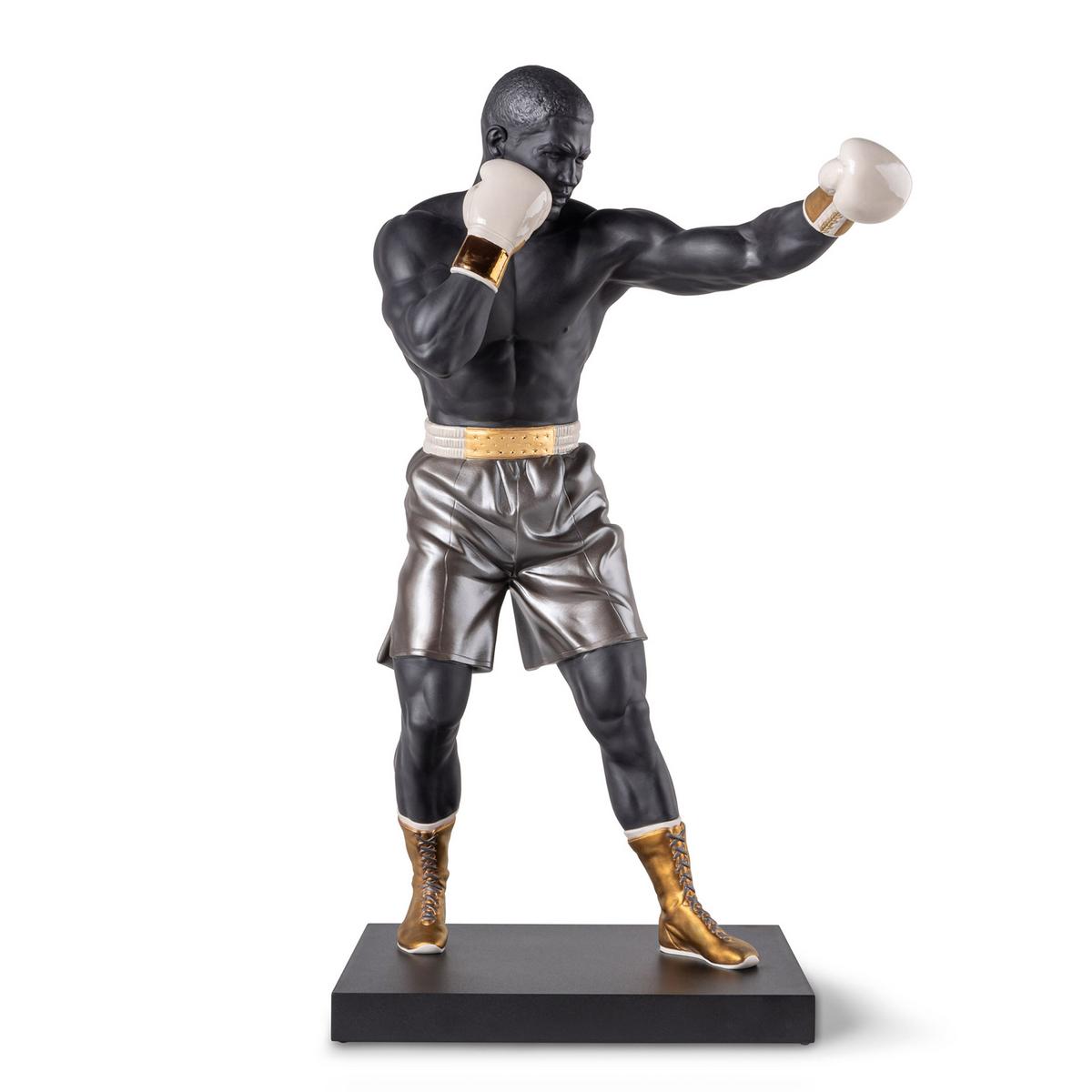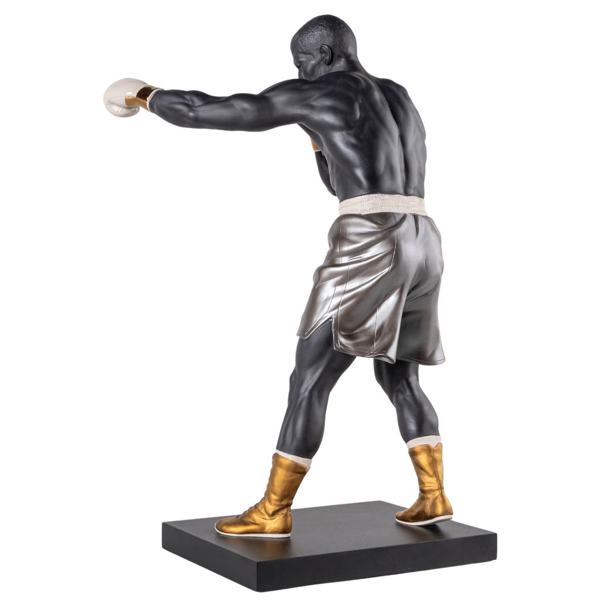 Die Skulptur "Boxer" von Lladró stellt einen Champion inmitten eines Kampfes dar. Die präzise realistische Modellierung zeigt jeden Muskel seines Körpers und jeden Zug seines Gesichtsausdrucks, konzentriert auf den nächsten Schlag. Auch die Dekoration der Lladró Figur ist etwas Besonderes: mattschwarz für den Körper, weiß glasiert für die Handschuhe und gold- und silberglänzend für die Shorts und Stiefel.