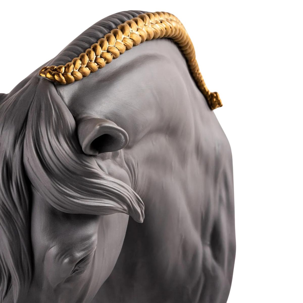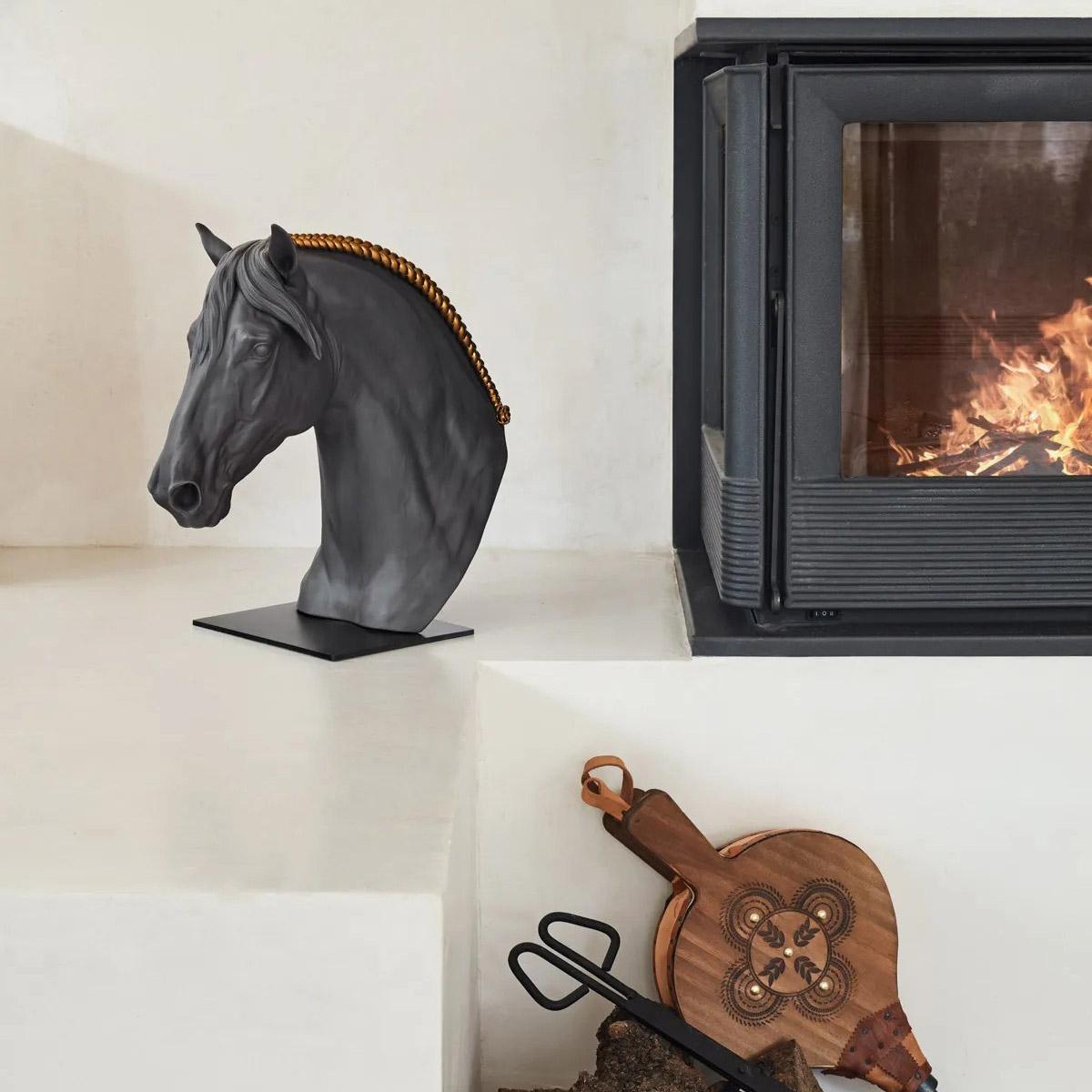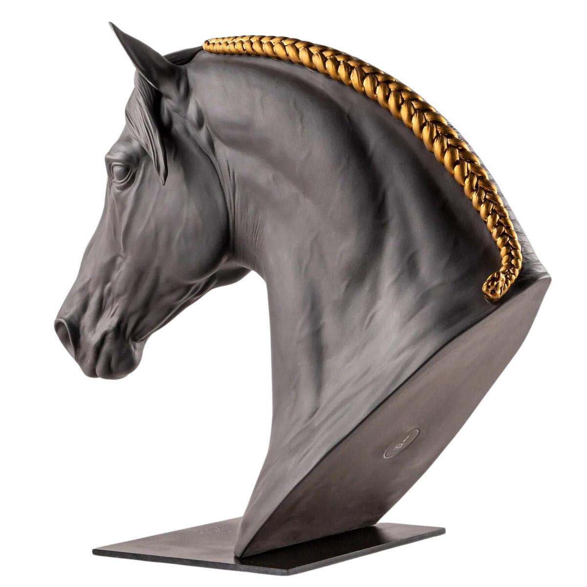 Diese zugleich realistische und stilisierte Skulptur "Equinus" ist ein Beispiel für die detaillierte vorherige anatomische Studie der Lladró Künstler und die Präzision der Modellierung. "Equinus" von Lladró ist eine Büste mit großer Ausdruckskraft und dekorativem Potenzial dank des Kontrasts zwischen dem schwarzmatten Porzellan und der mit goldenem Glanz verzierten geflochtenen Mähne des Pferdes.