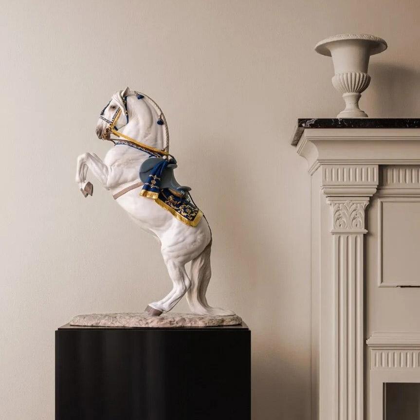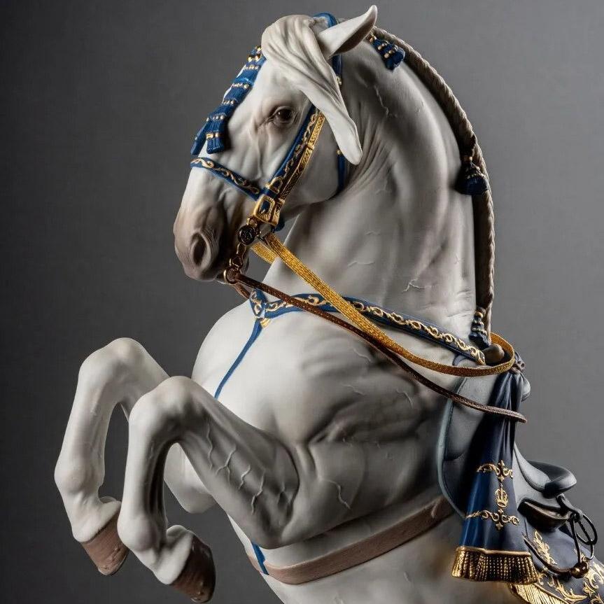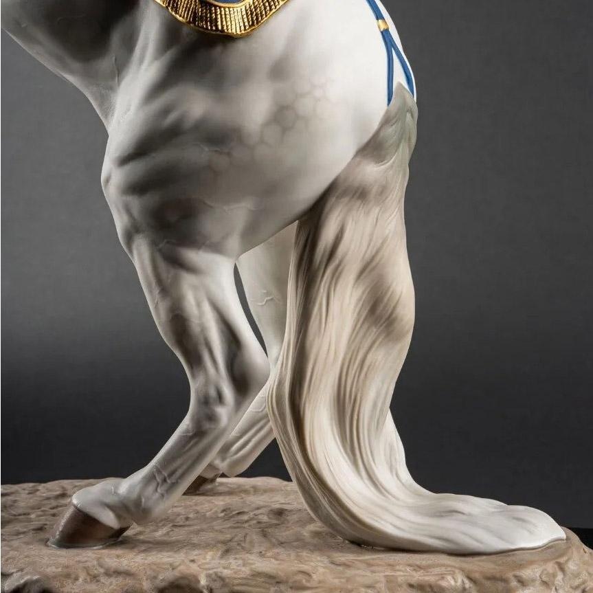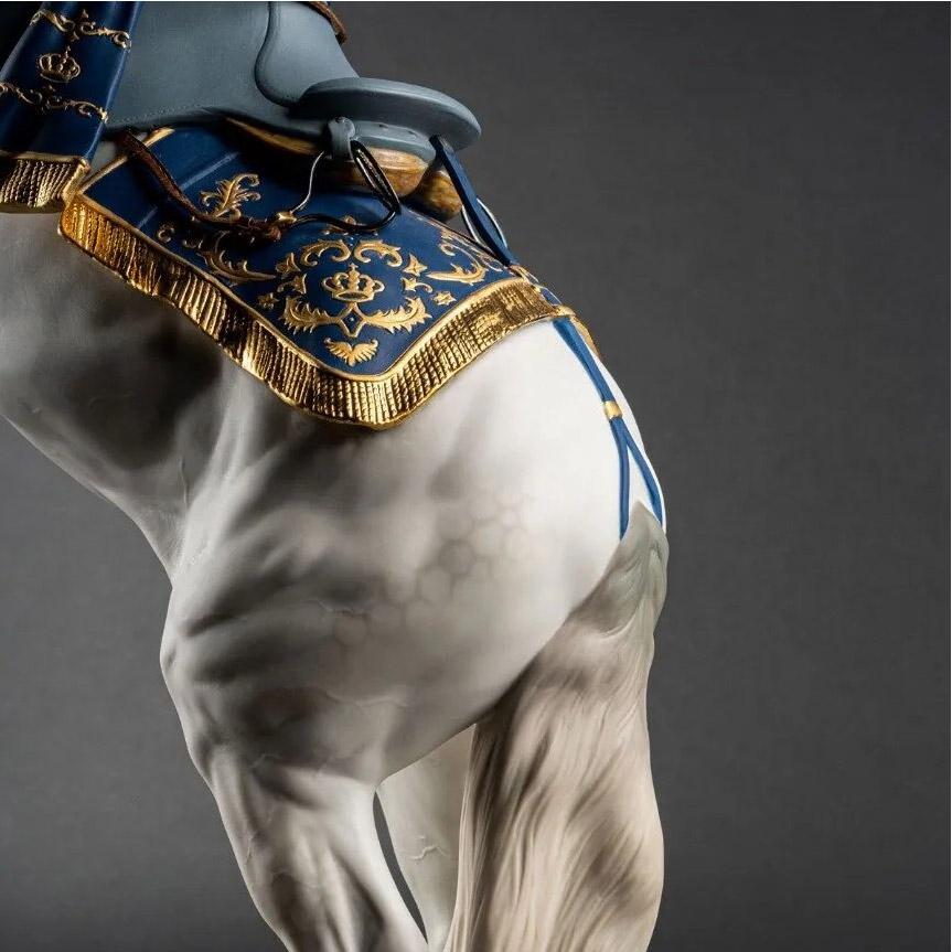 Die Skulptur sieht ihrem lebensechten Vorbild so unwahrscheinlich ähnlich, dass einem der Atem stockt. Die anatomische Präzision und die Dekoration des Pferdes sind besonders beeindruckend. Das Kopfstück, der Sattel und die Satteldecke kombinieren ein intensives Blau mit Gold. Das Halfter und die Steigbügel bestehen aus vergoldetem Messing und Naturleder. Solche einzigartigen Kunstwerke aus Porzellan schafft es nur die spanische Manufaktur Lladró zu fertigen.