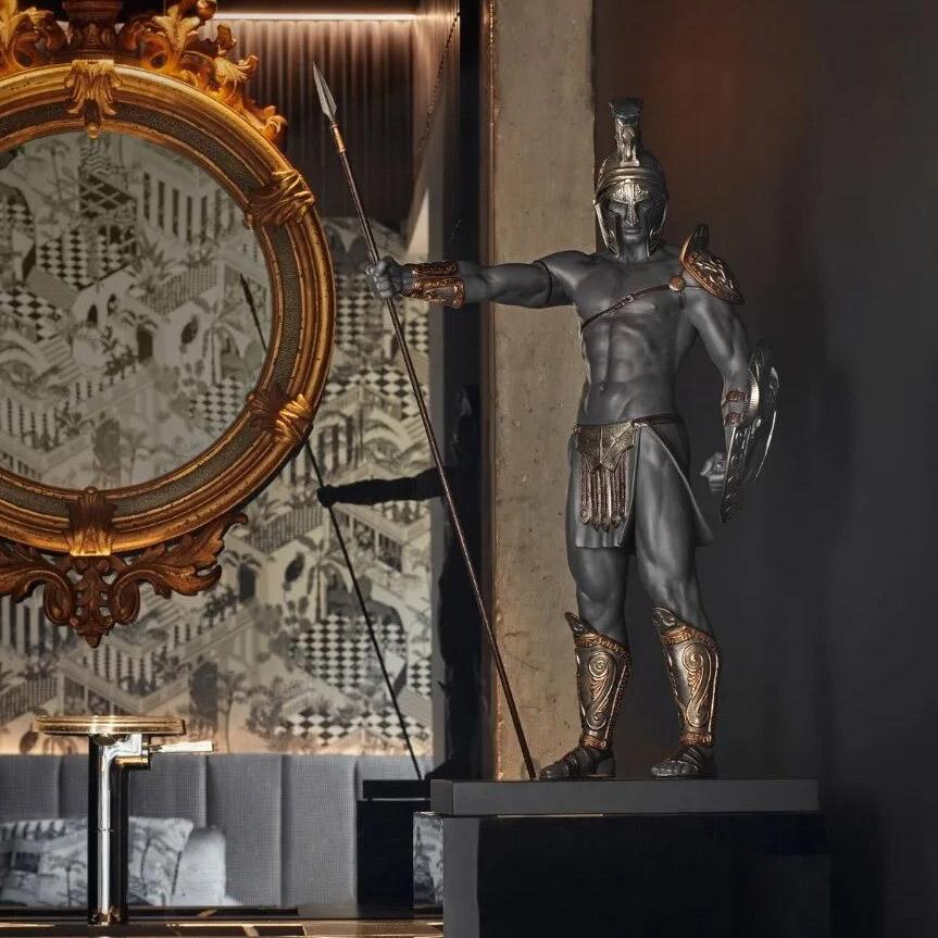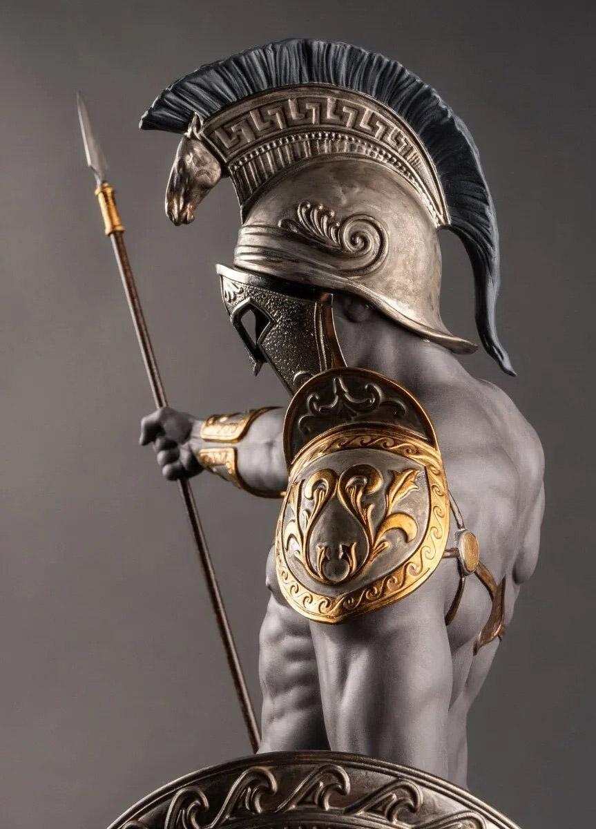 Der Detailreichtum des Dekors, die präzise modellierte Anatomie und die sorgfältige Verzierung zeugen von einer außergewöhnlichen Virtuosität der Lladró Künstler. Die 6 kg schwere Figur ist aus schwarzem Porzellan gefertigt und mit metallischem Kupfer, blauer und schwarzer Emaille verziert. Der Schild ist mit schwarzem Glanz mit Marmoreffekt bemalt, während der Helm mit gealtertem Silberglanz verziert ist.