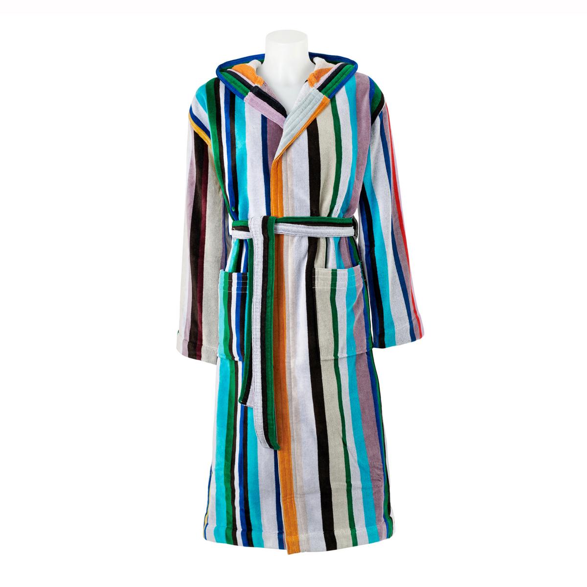 Verbringen Sie ruhige Wellness-Momente in den lässig-eleganten Bademänteln "Chase" von Missoni Home. Eine stimmige Farbkomposition aus lavendelfarben, blauen, schwarzen, grünen und weißen Längsstreifen verleiht der Kollektion einen heiteren, sonnigen Charakter. Missoni Home Frottierwäsche besteht aus 100% Baumwolle mit zwei unterschiedlichen Seiten, einer flauschig-weichen Velourseite und einer saugfähigen Schlingenfrottier-Seite. Dank Kapuze, Gürtel und großen Taschen lassen sich die wadenlangen Bademäntel gerne etwas länger tragen.